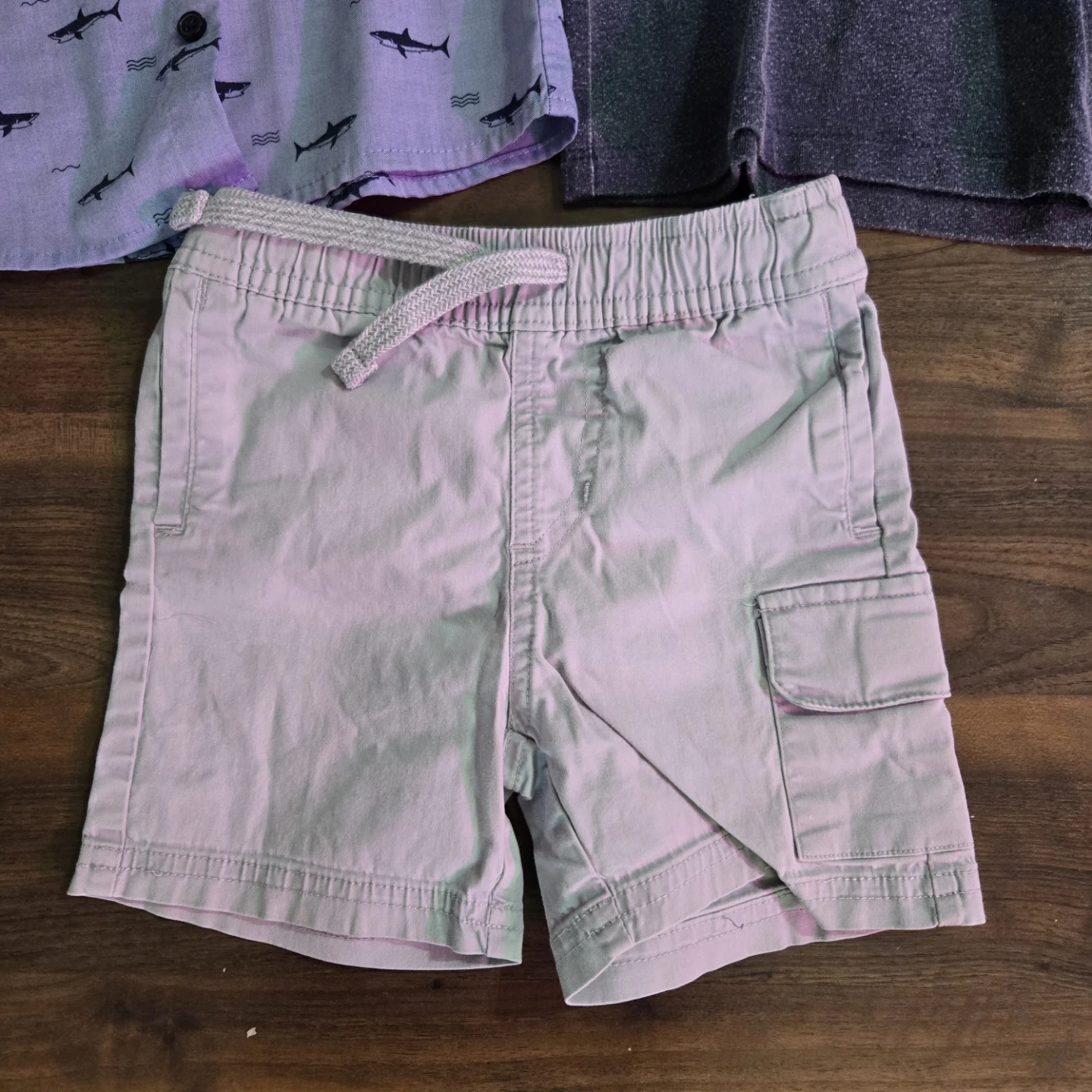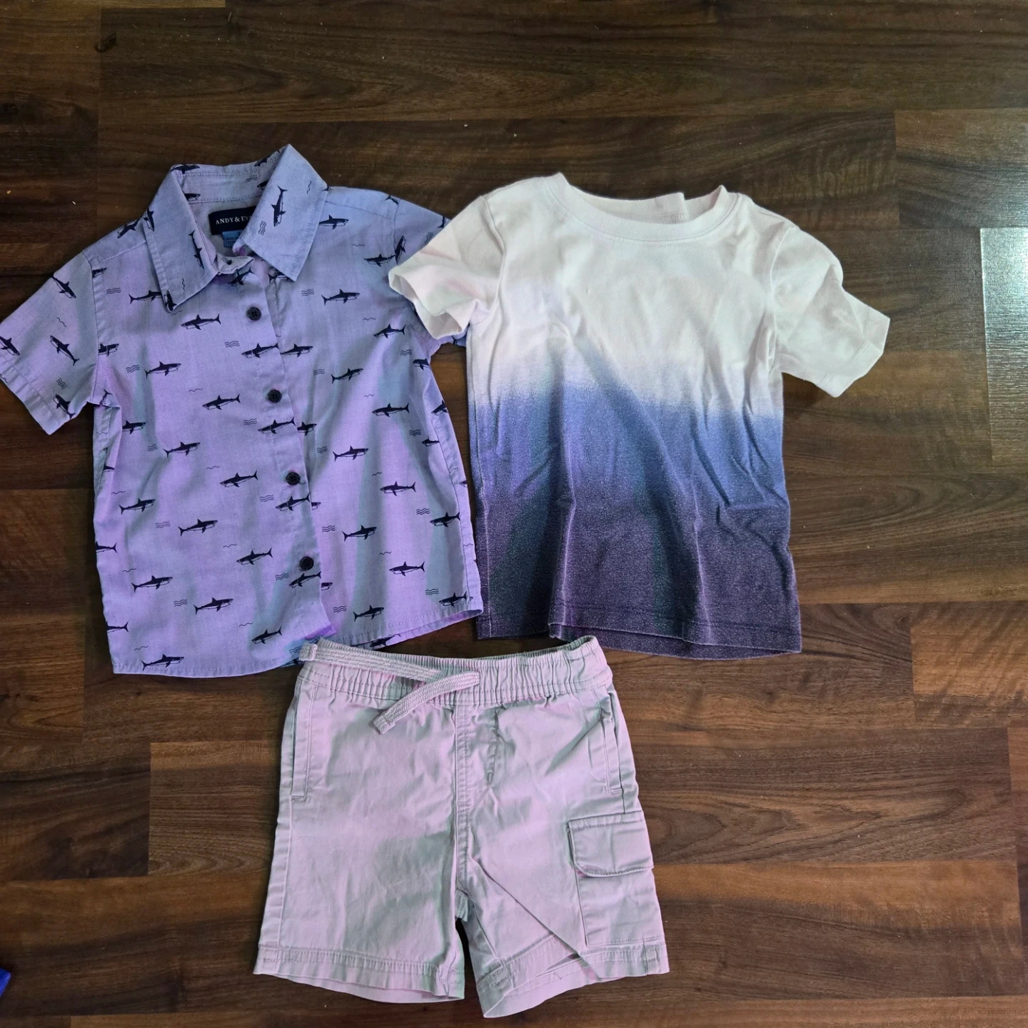 Selling a cute outfit set for boys! It includes a button-up shirt with a shark pattern and a pair of shorts. Also comes with a white and blue ombre t-shirt. All items are in great condition and ready for a new home!