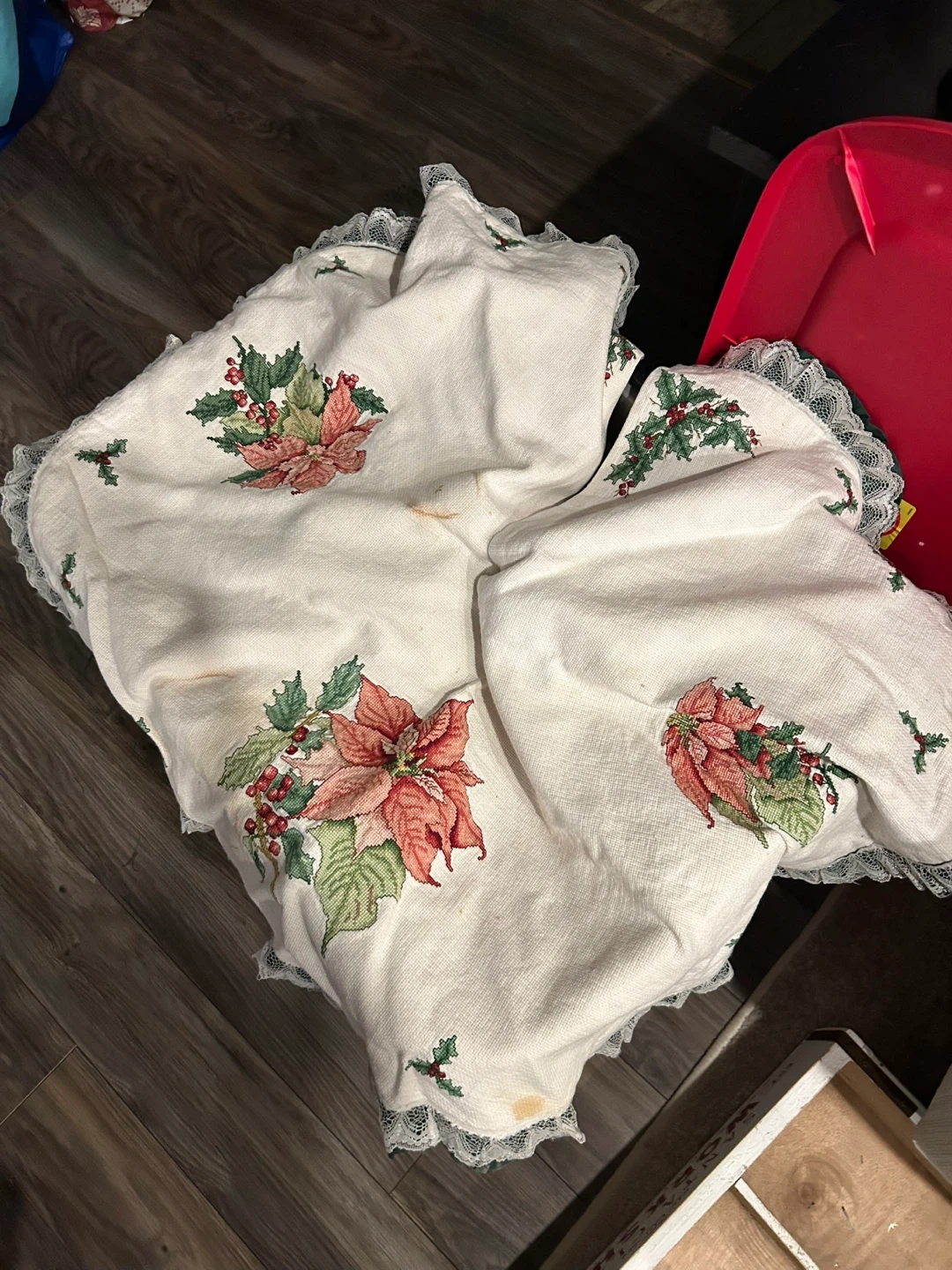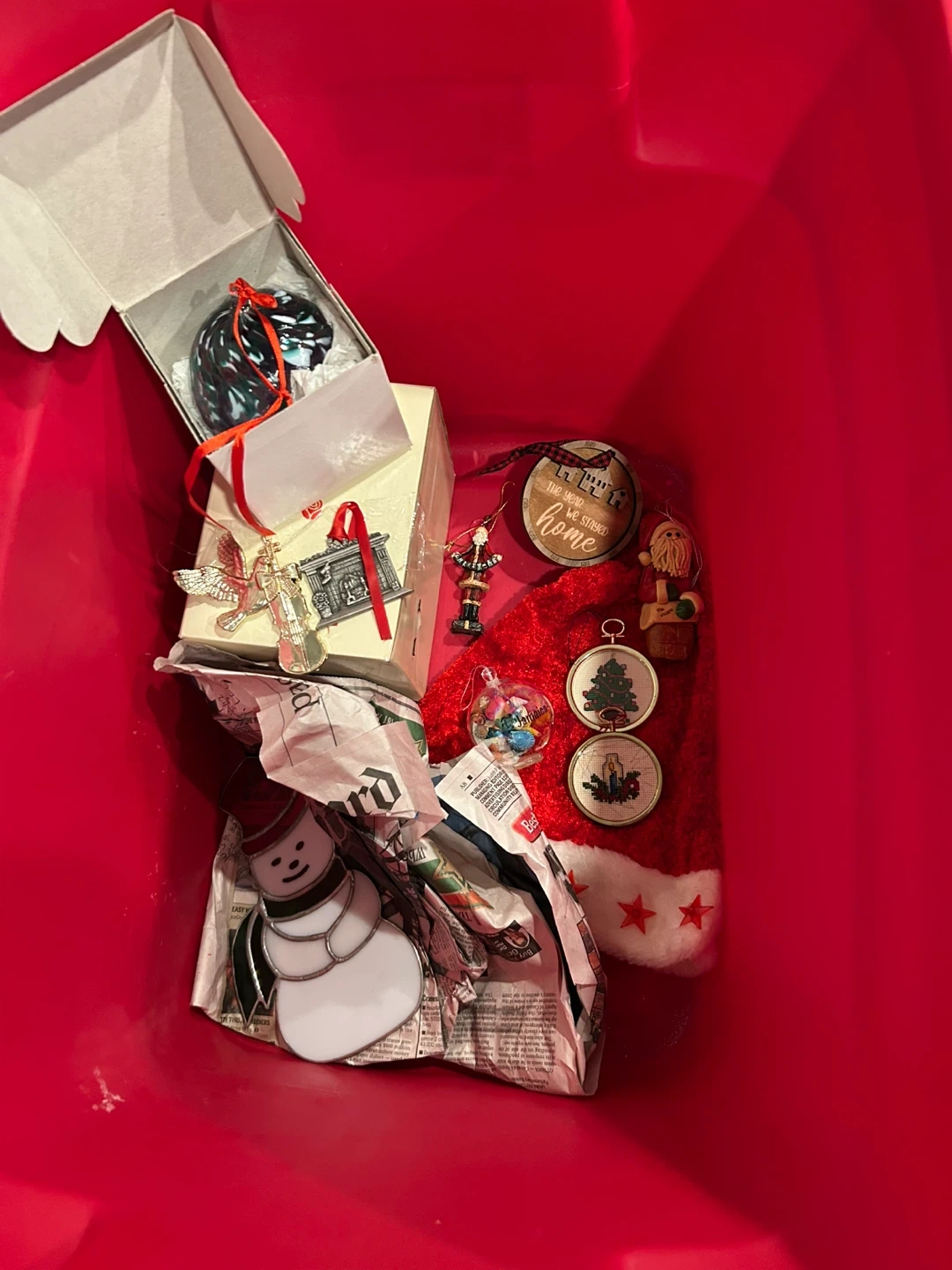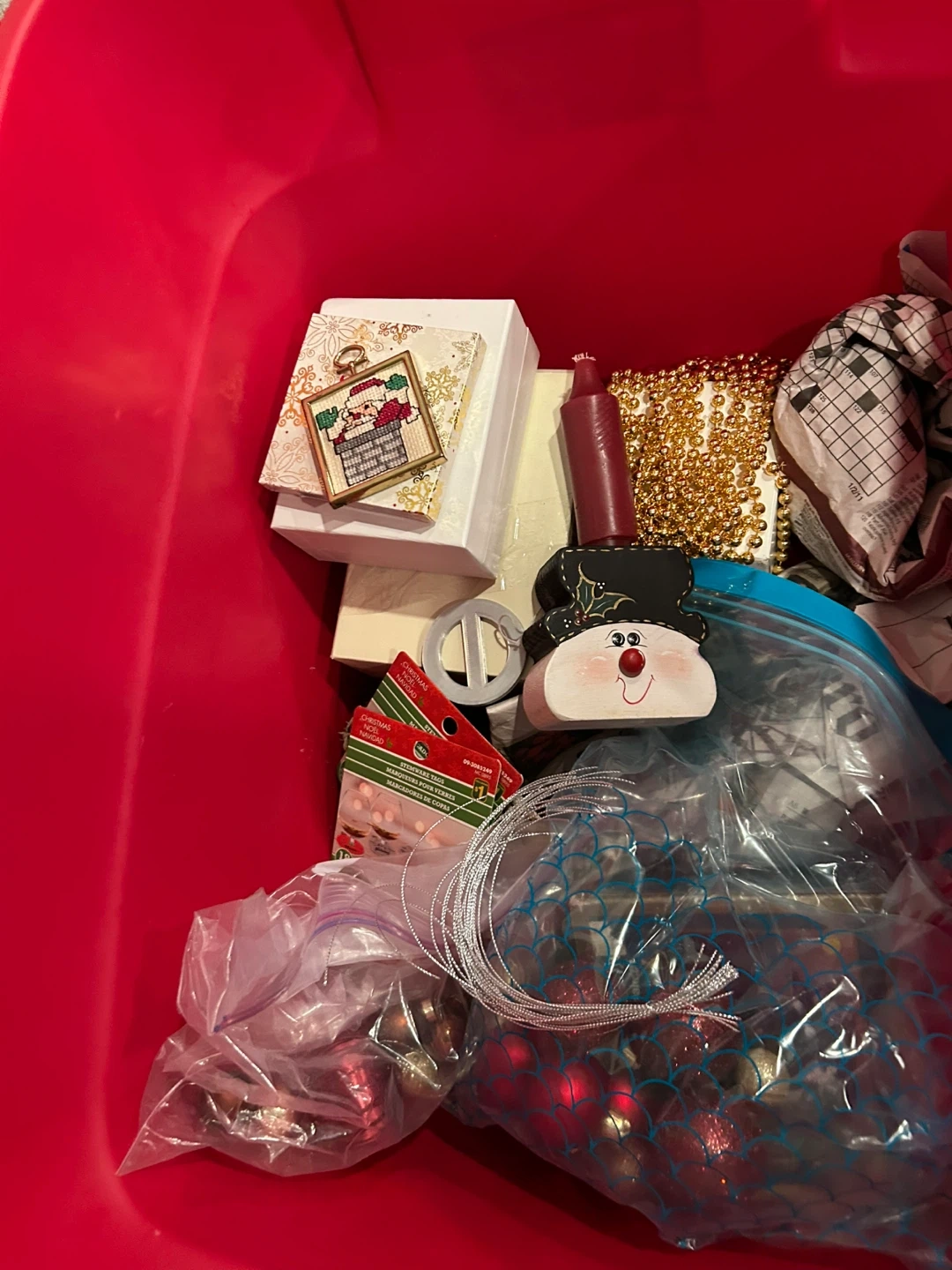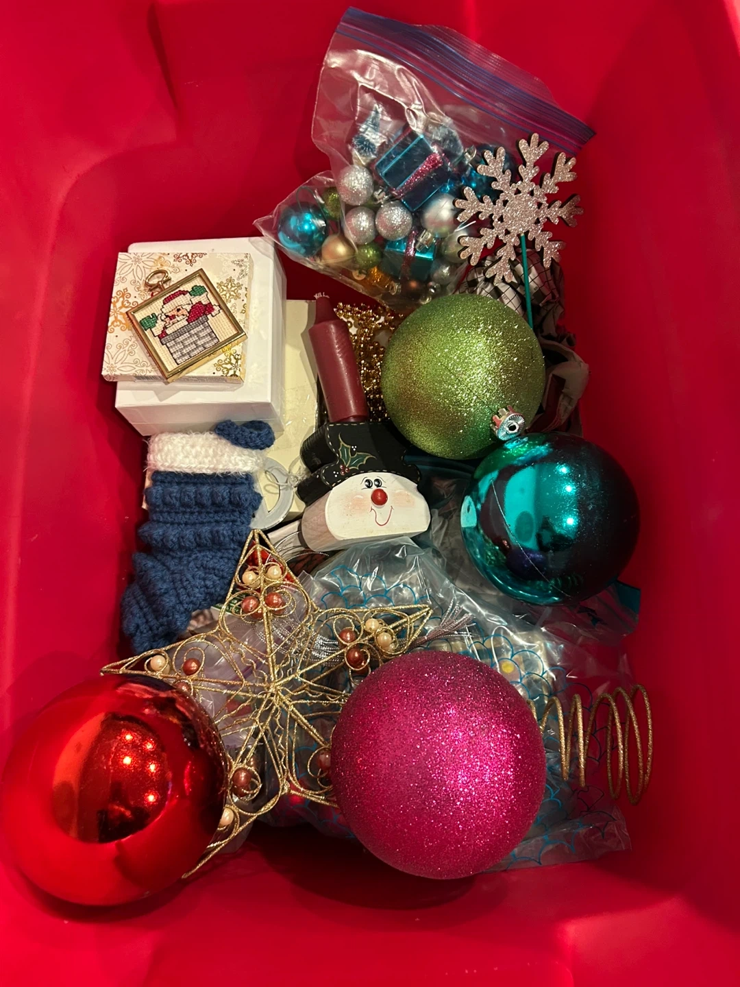A collection of Christmas ornaments and decorations, including a snowflake ornament in a box, beaded garland, small decorative figurines, and a snow globe. Perfect for adding some holiday cheer to your home!