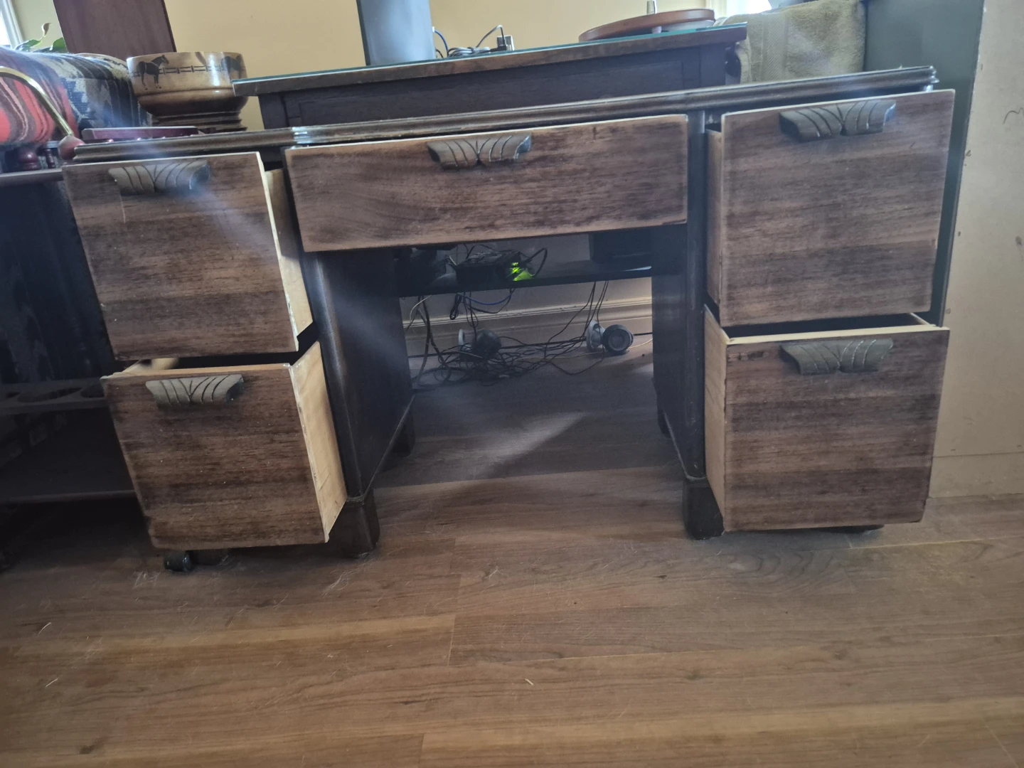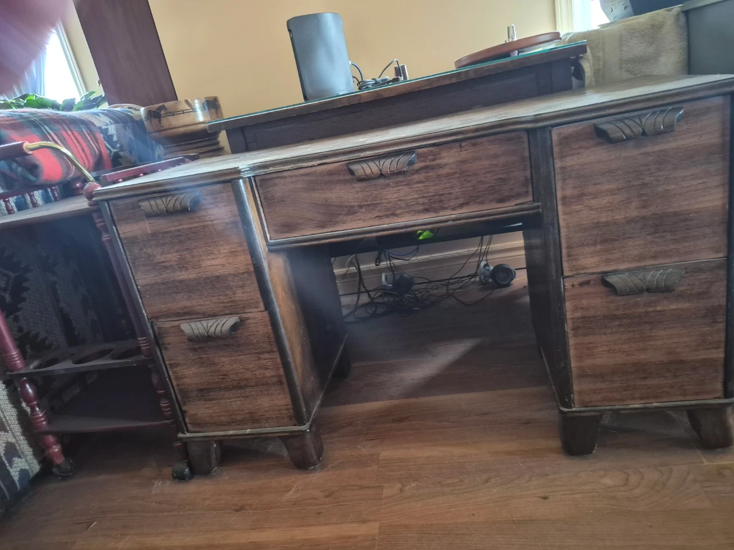 Selling a vintage wooden desk. It has a lot of character and would look great in the right space. It features multiple drawers for storage. All the draws work easily. Height 27 in. Depth 17 in. WIDTH 43in.