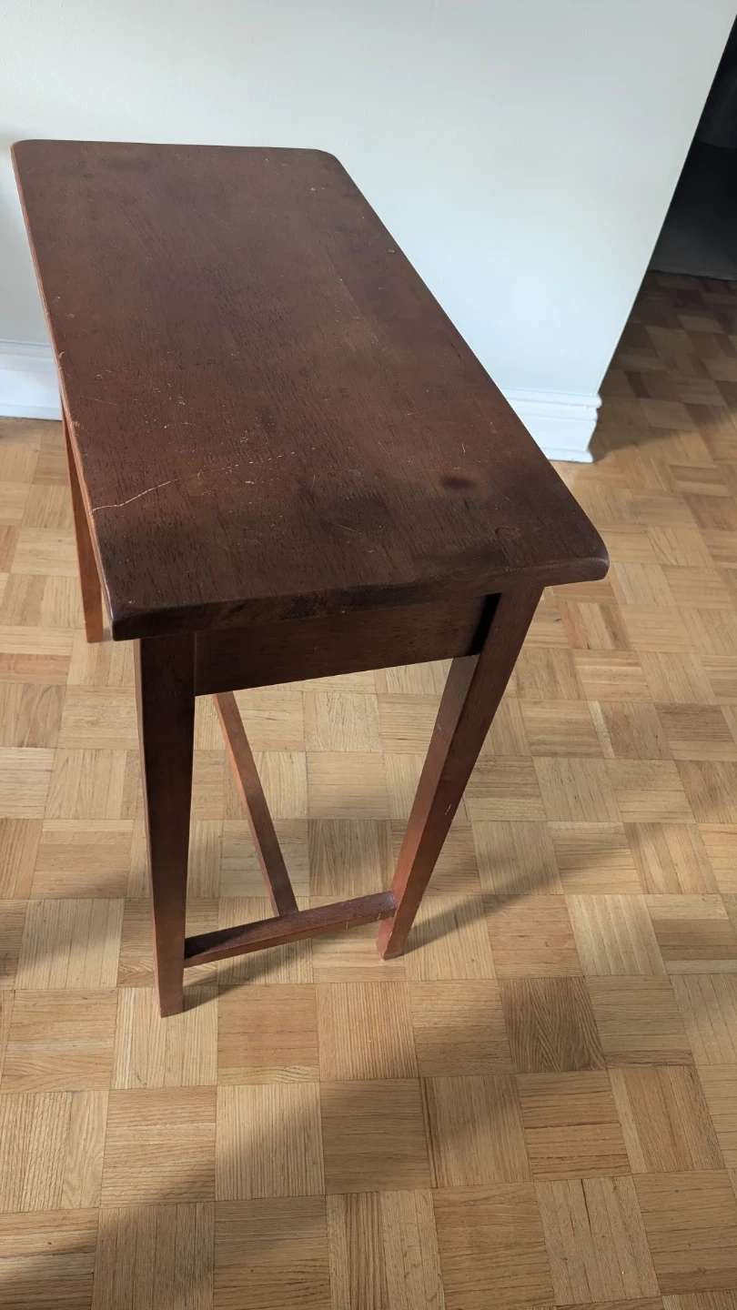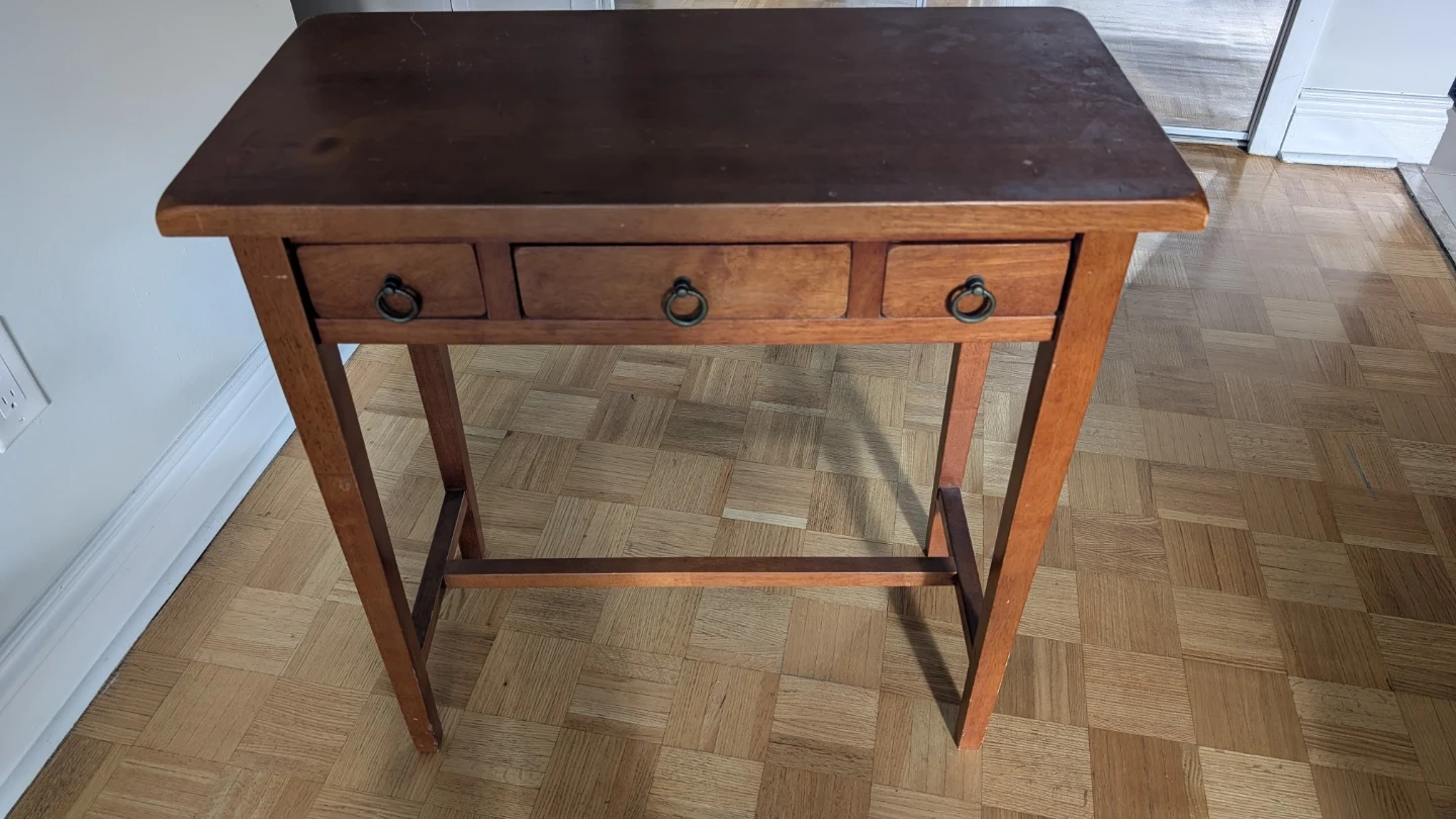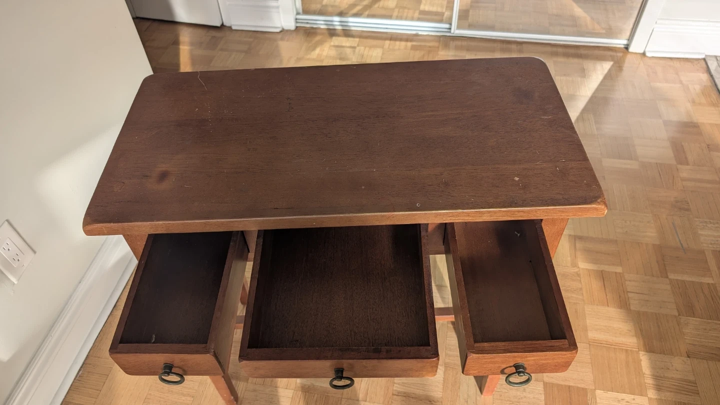 A cute little wooden side table with three drawers! It's perfect for a small space or as an accent piece. It has a warm, brown finish and a classic design. It can also be used as minimal office work.