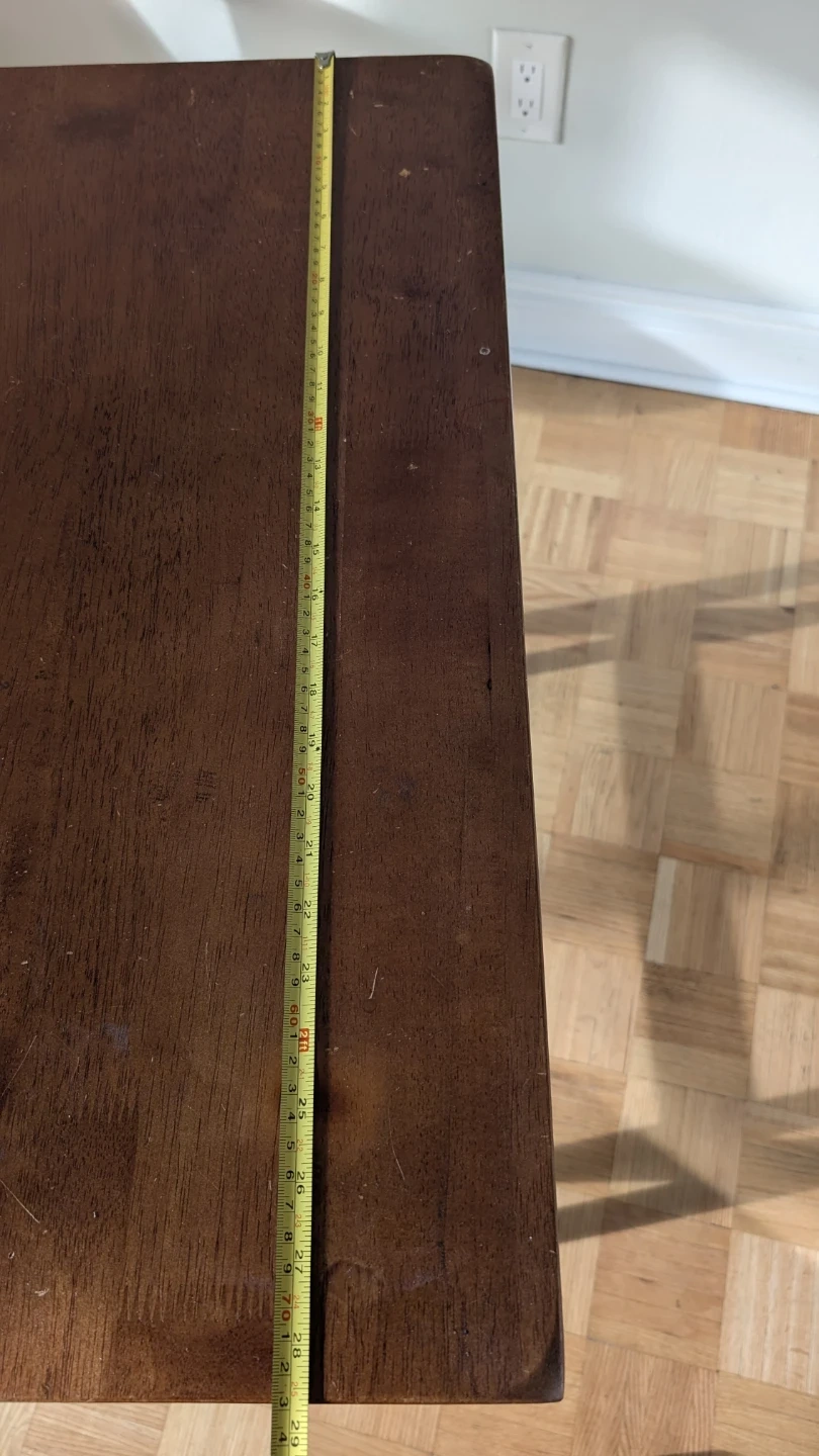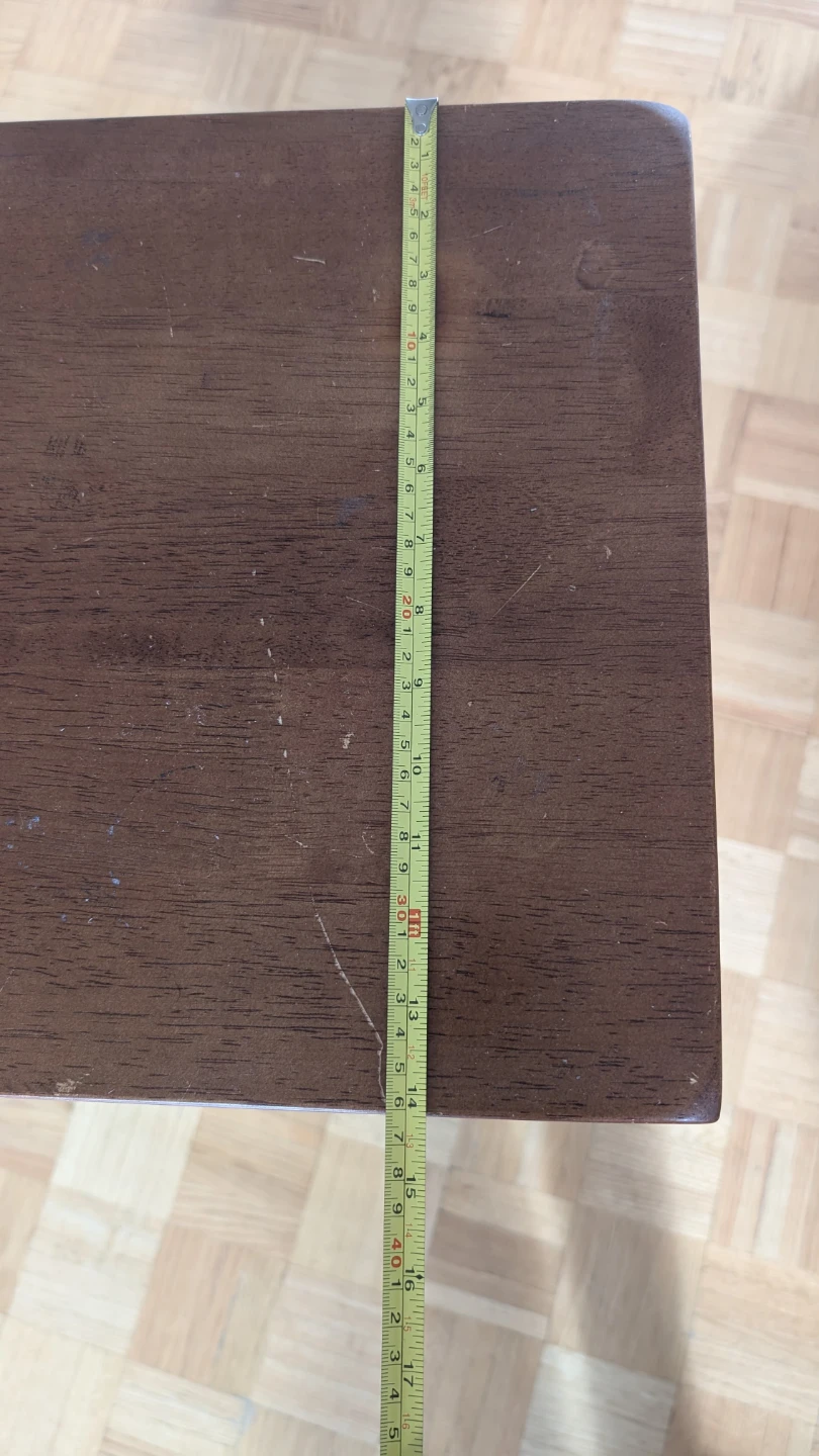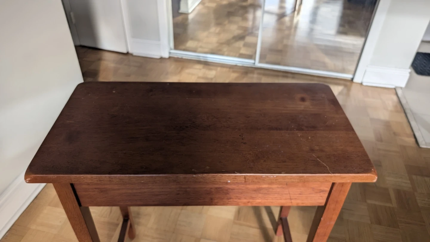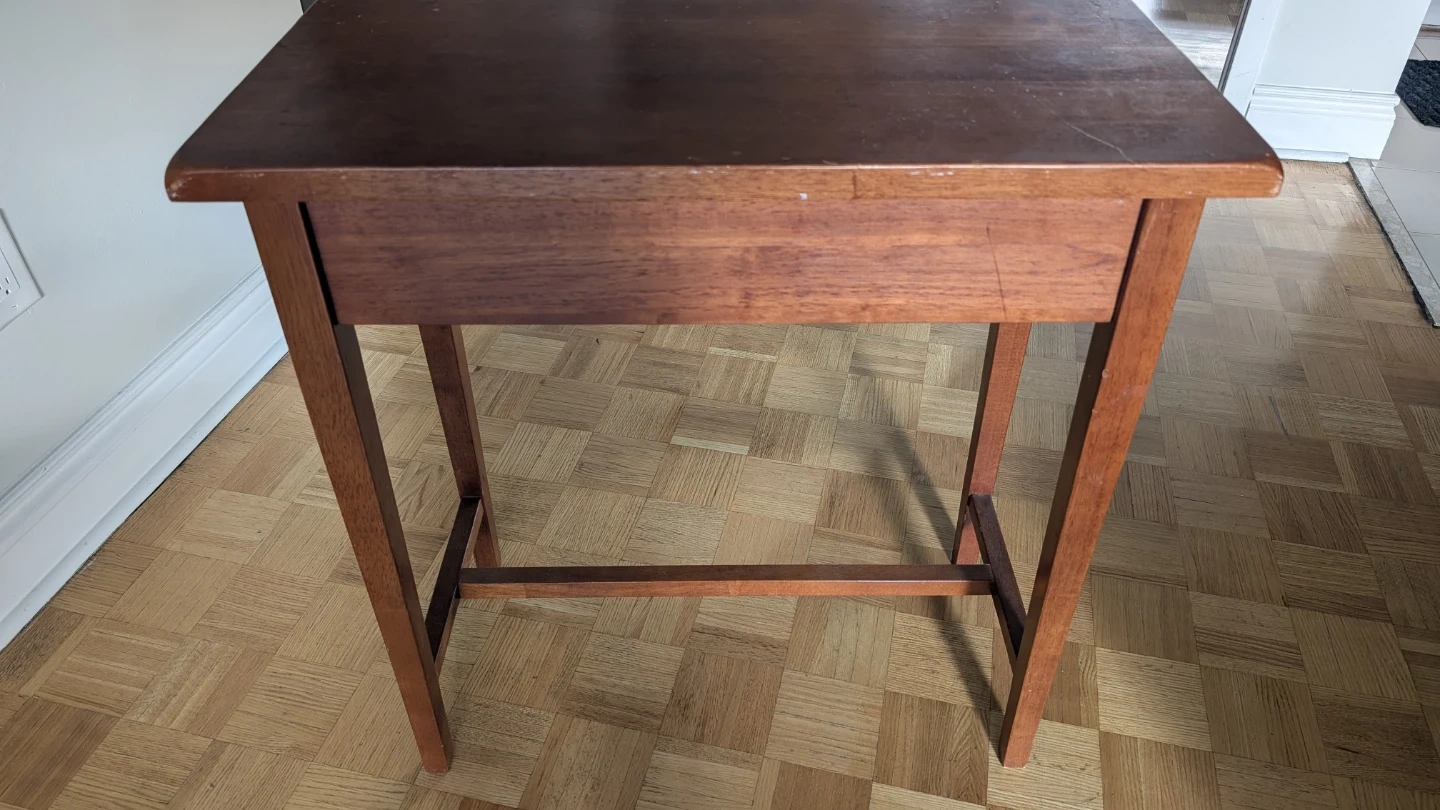 A cute little wooden side table with three drawers! It's perfect for a small space or as an accent piece. It has a warm, brown finish and a classic design. It can also be used as minimal office work.