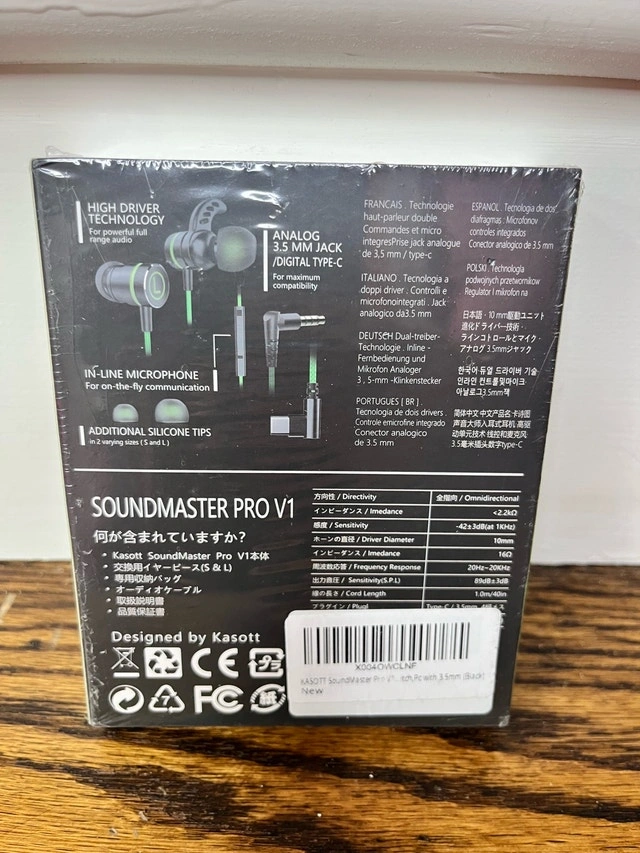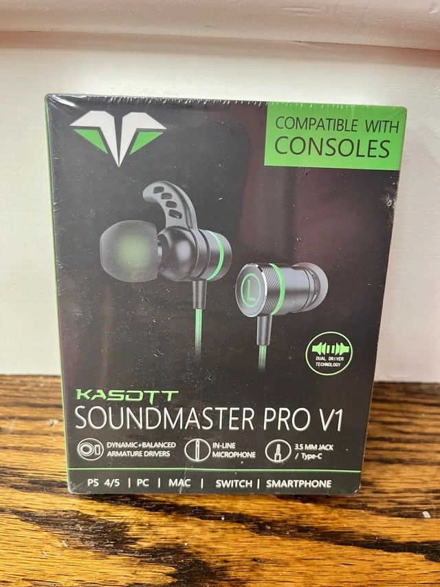 I'm selling a new Kasott Soundmaster Pro V1 Gaming Earbuds for PS4/5, PC, Mac, Switch, and Smartphones with 3.5mm jack. Here are the specifications: * Dynamic + balanced armature drivers * In-line microphone * 3.5mm jack / Type-C Ready