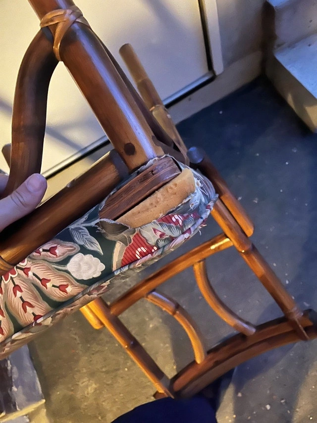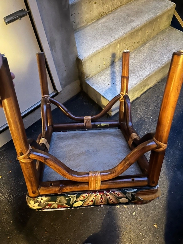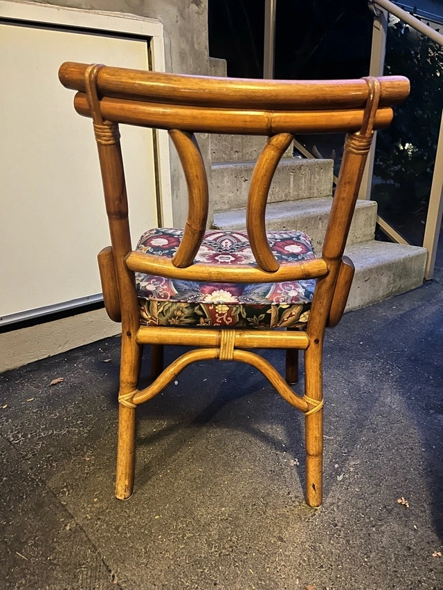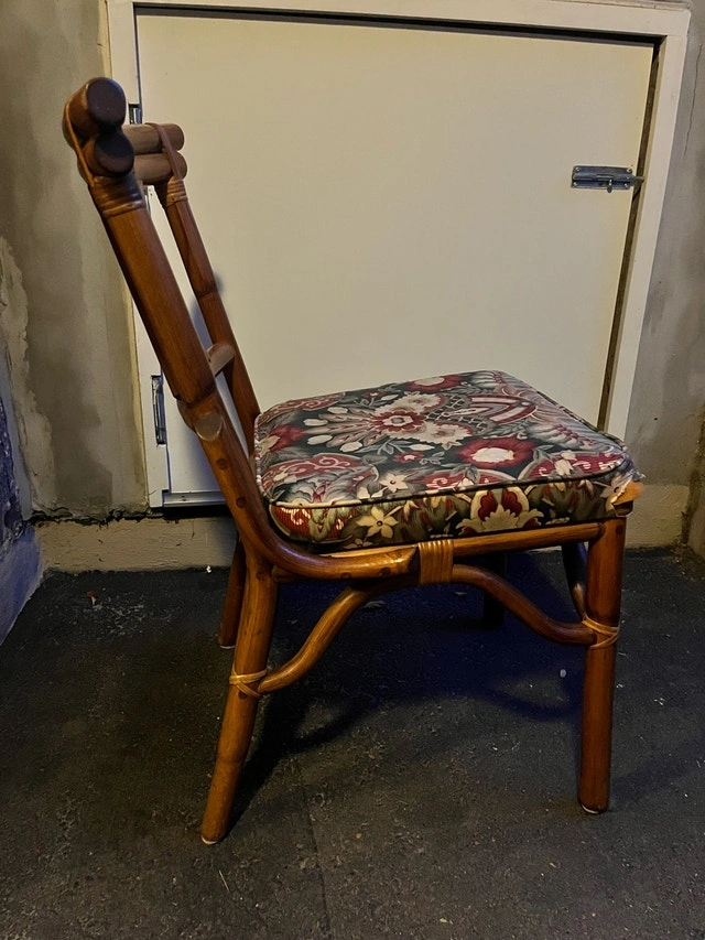 This used bamboo chair features a unique design and a comfortable, cushioned seat with floral upholstery. The chair shows some wear and tear, as can be seen in the photos, but it remains sturdy and stylish, perfect for adding a touch of vintage charm to any room. Frame is good and sturdy. Will need to be reupholstered/repaired.
