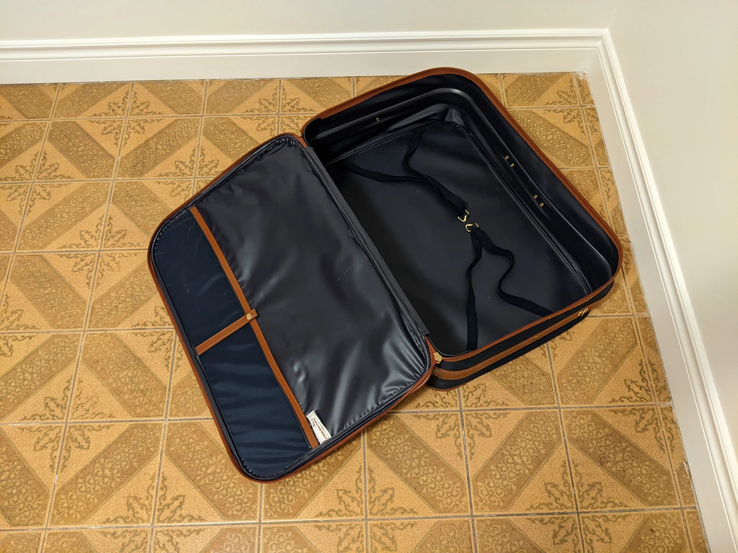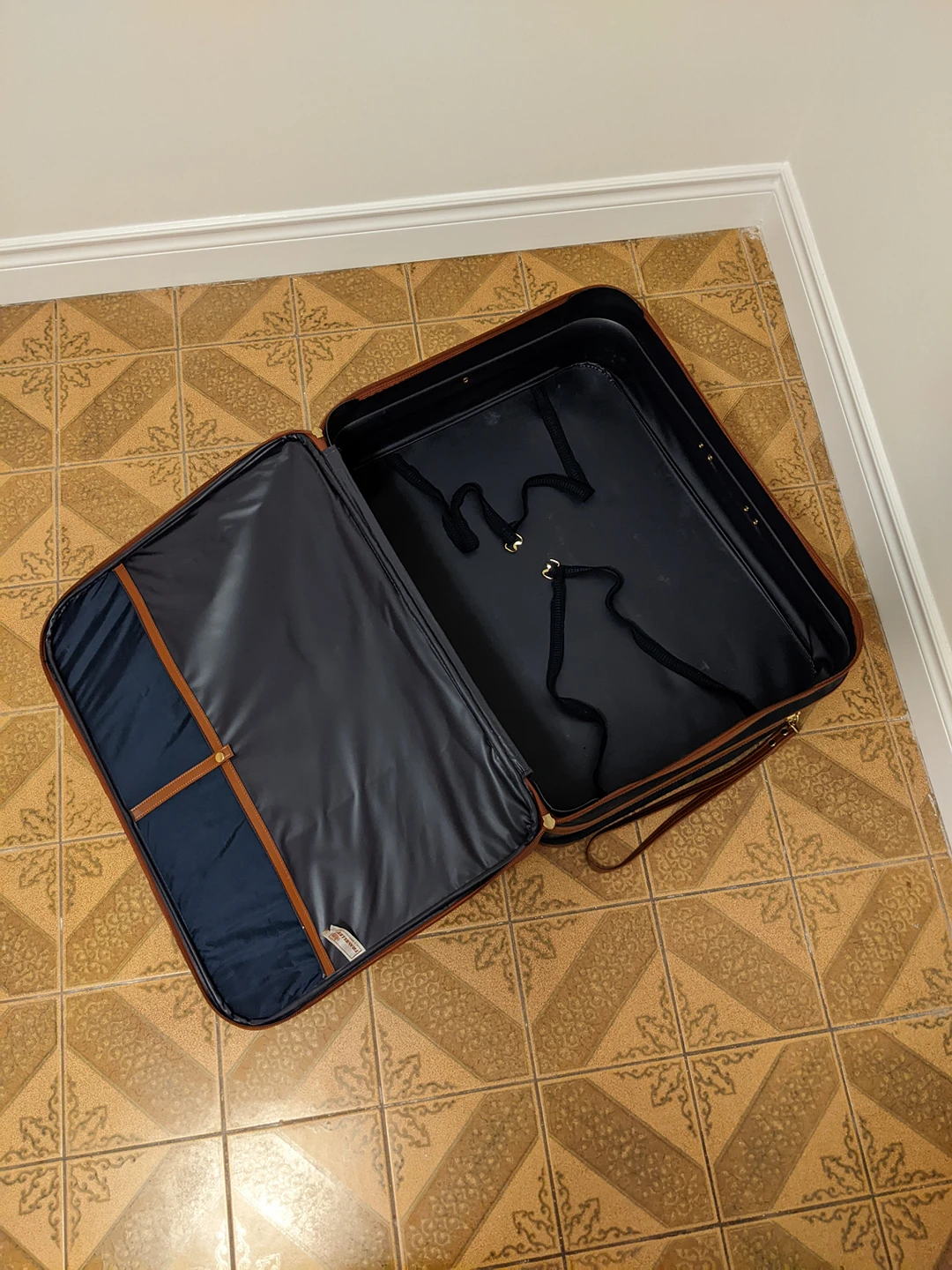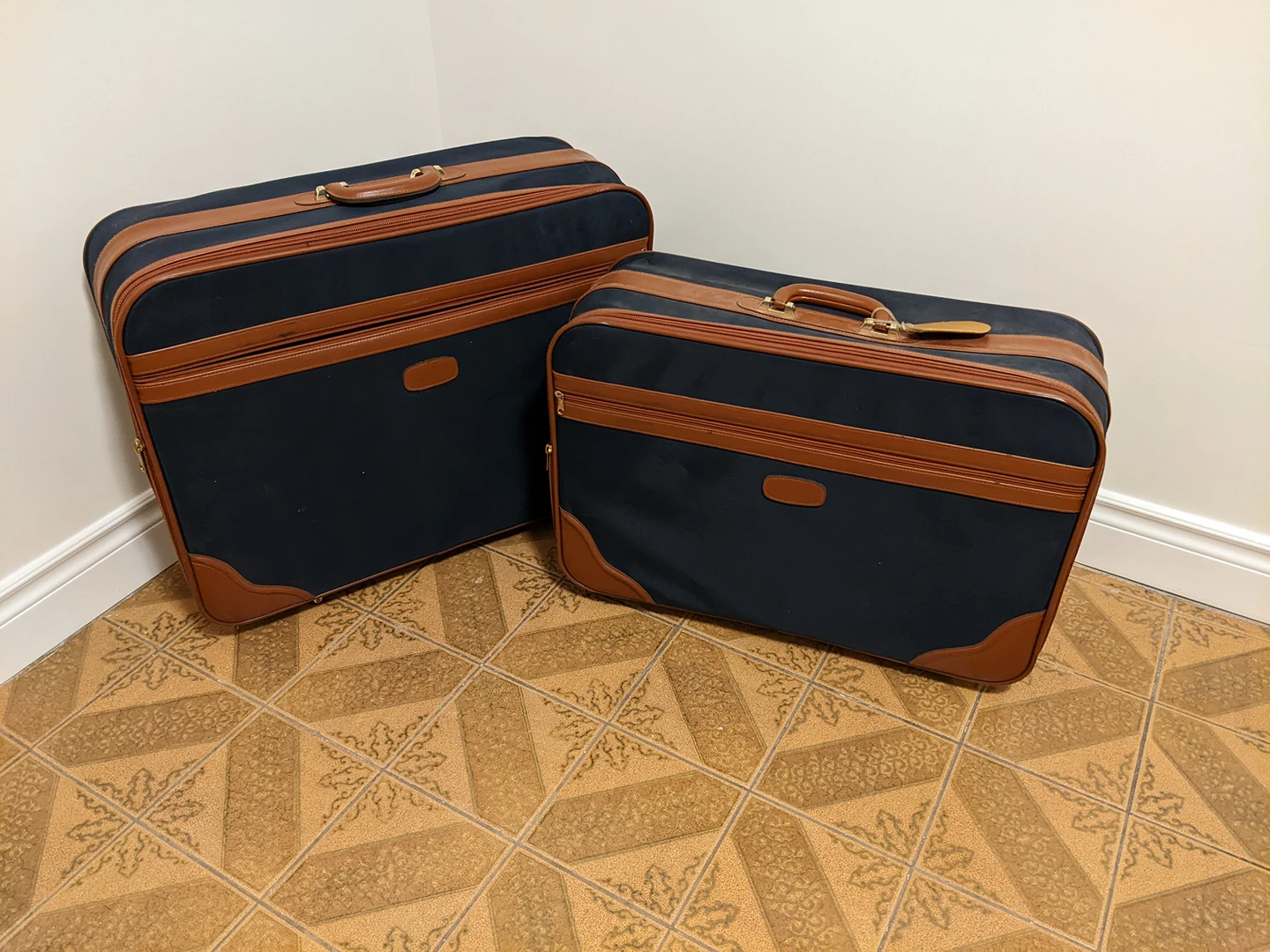 Matching brown and navy blue luggage. Sturdy with wheels in the bottom. Inside and outside pockets and securing strap.
