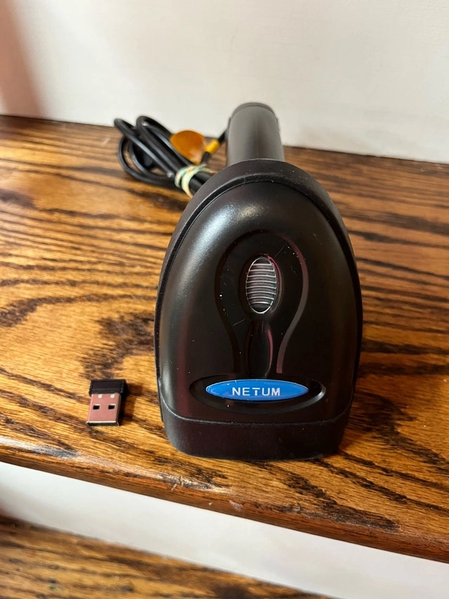 This is a Netum NT-1698W wireless barcode scanner with a USB receiver for easy connectivity. This scanner is in good working condition and ready to use in your business or personal projects.