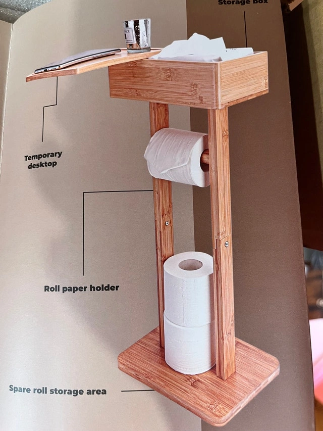 Spruce up your bathroom with this new bamboo toilet paper holder with shelf. It's not just a toilet paper holder; it's a statement piece! Keep your bathroom essentials handy and add a touch of nature with its sleek bamboo design. It's the perfect blend of function and style! The shelf on top can be used to store wipes, a phone, or an air freshener! A perfect addition to any washroom. Specifications: * Material: Bamboo * Features: Top shelf for extra storage * Style: Modern, minimalist design Check out my other listings for more cool stuff!