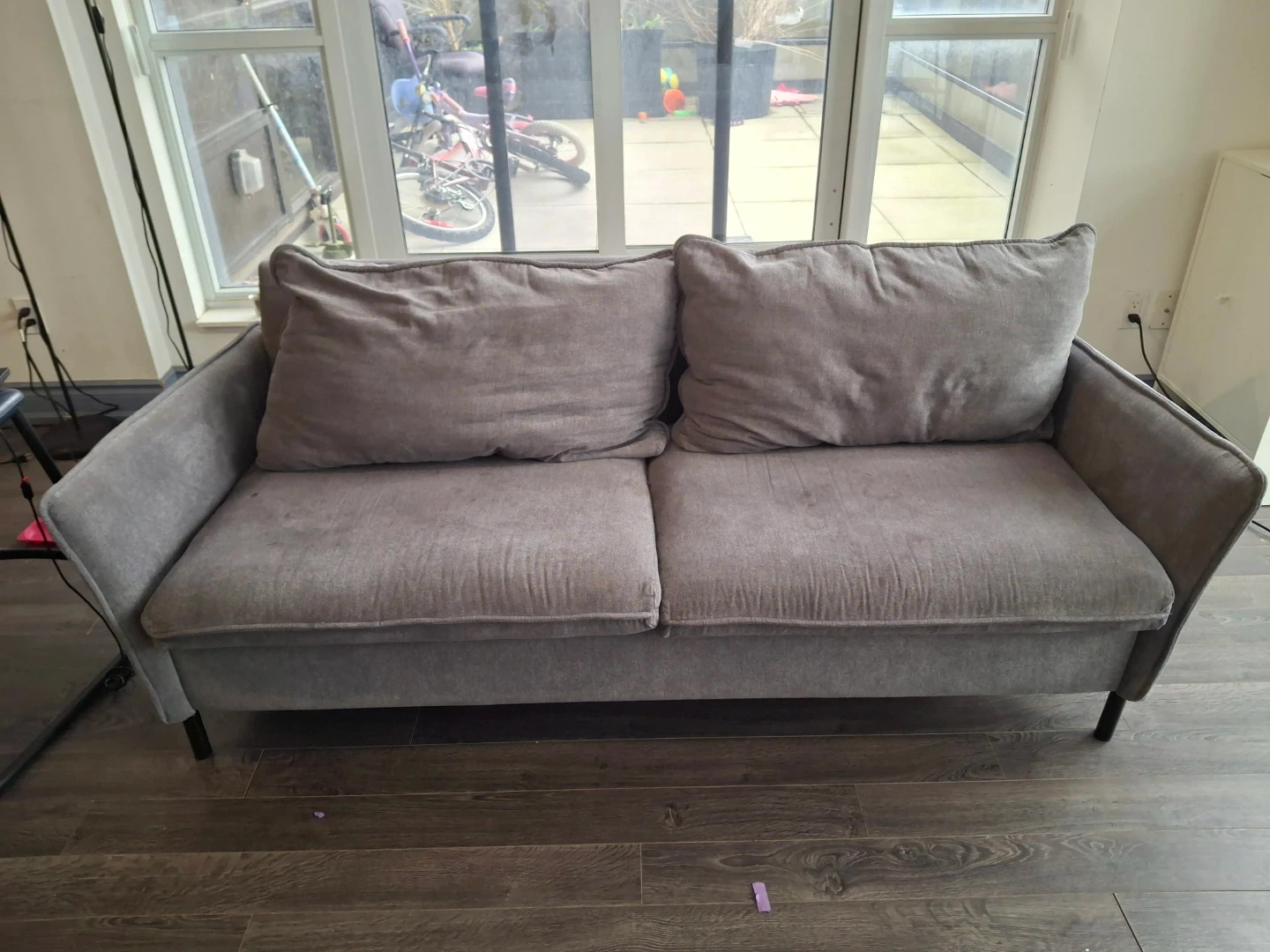 Selling a comfy grey loveseat sofa. It's in good condition and perfect for a small space or apartment. The material is soft and the cushions are nice and plush!