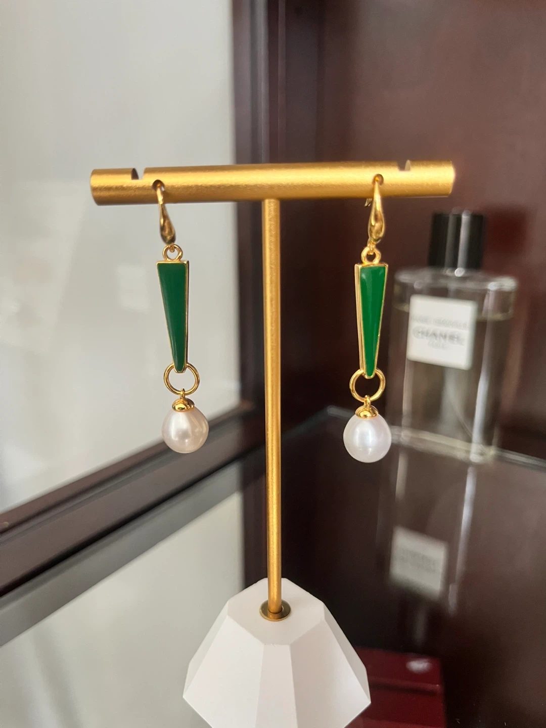 These are a pair of elegant dangle earrings. They feature a gold-tone finish with a green triangle detail and a faux pearl at the bottom. Perfect for adding a touch of sophistication to any outfit!