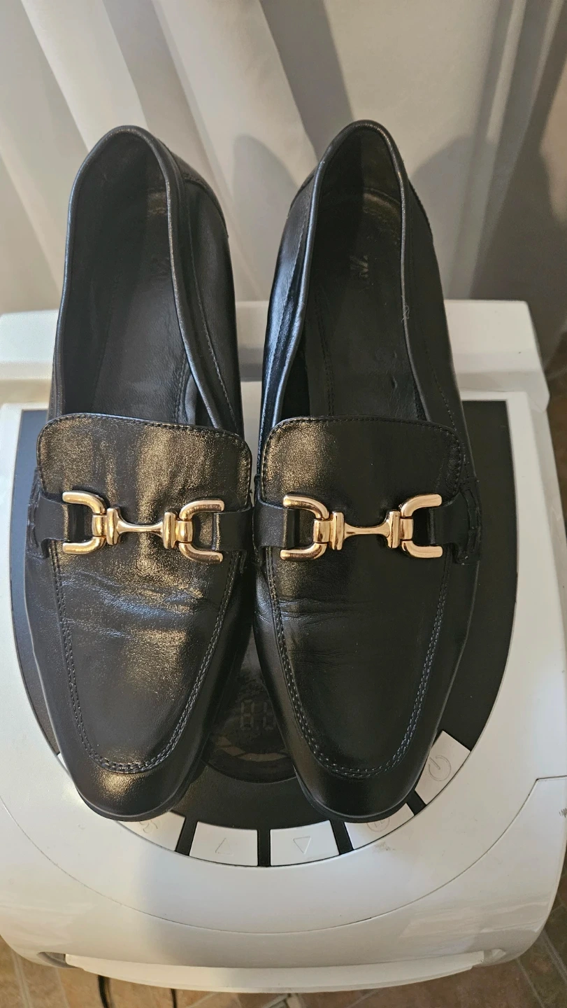Selling a pair of Zara black leather loafers in size 40. They are in great condition and feature a stylish gold-tone buckle detail. Perfect for adding a touch of sophistication to any outfit!