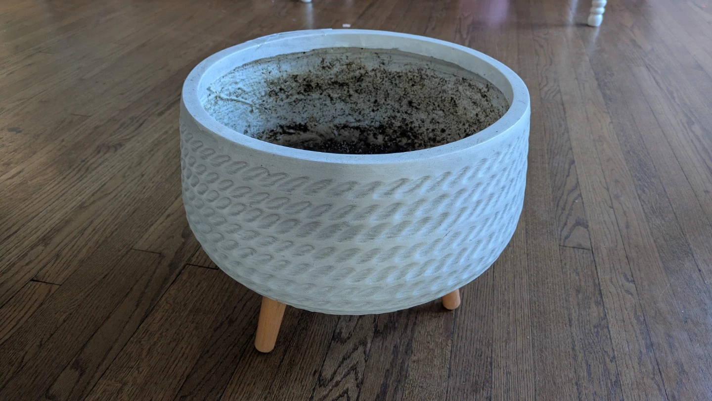 Selling a nice 15" white ceramic planter with wooden legs. It's in ok condition and ready for a new home for your plants!