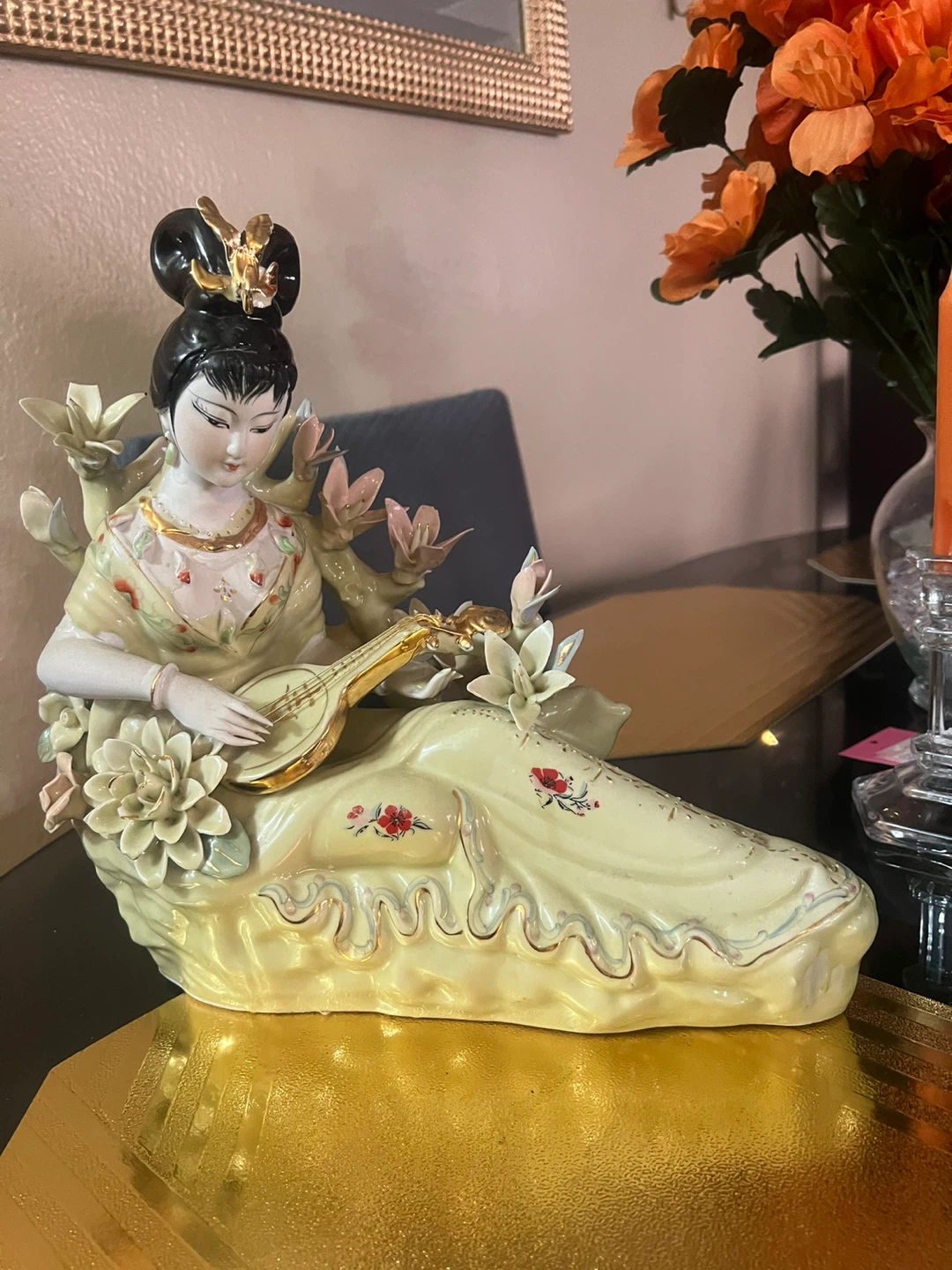 This is a vintage figurine of an Asian woman playing a stringed instrument. It's a beautiful piece with intricate details and floral accents. It would be a lovely addition to any collection or home decor