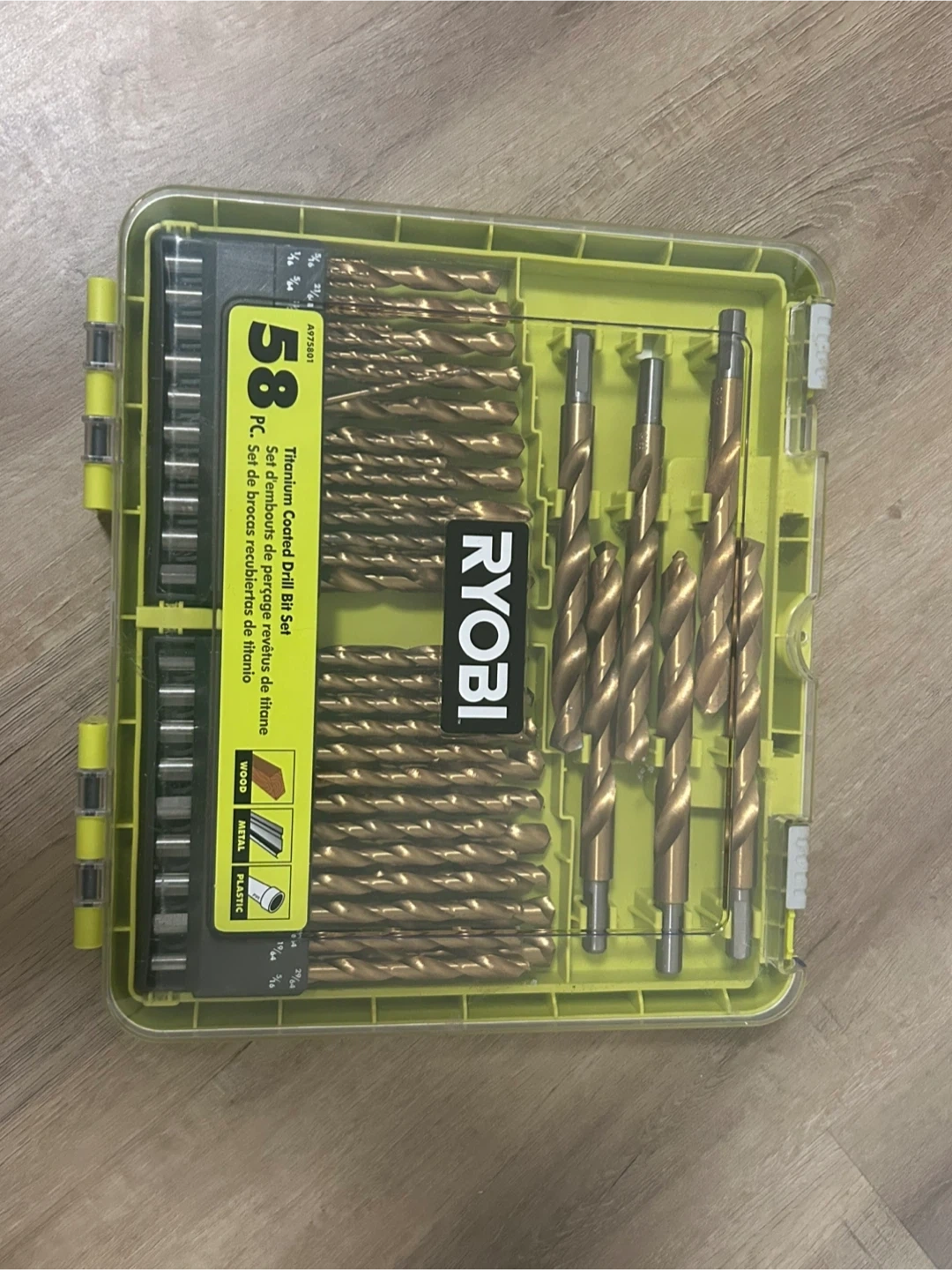 Selling a Ryobi 58-piece titanium coated drill bit set! Perfect for wood, metal, and plastic projects. Comes in its original case.