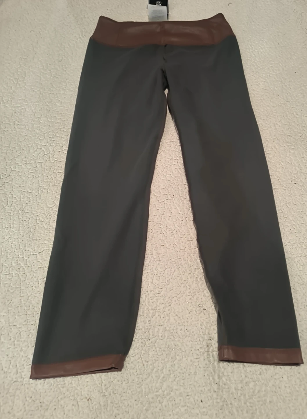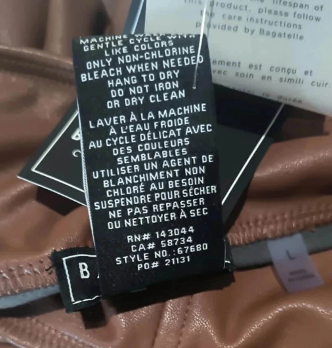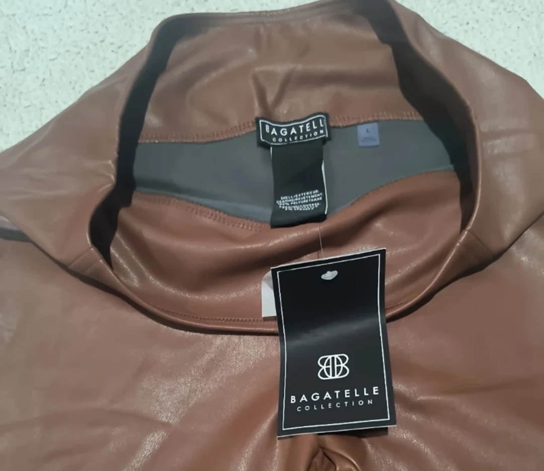 These pants are from Bagatelle Collection. They are a size large and made of faux leather. The shell is 100% polyurethane, and the backing is 94% polyester and 6% spandex