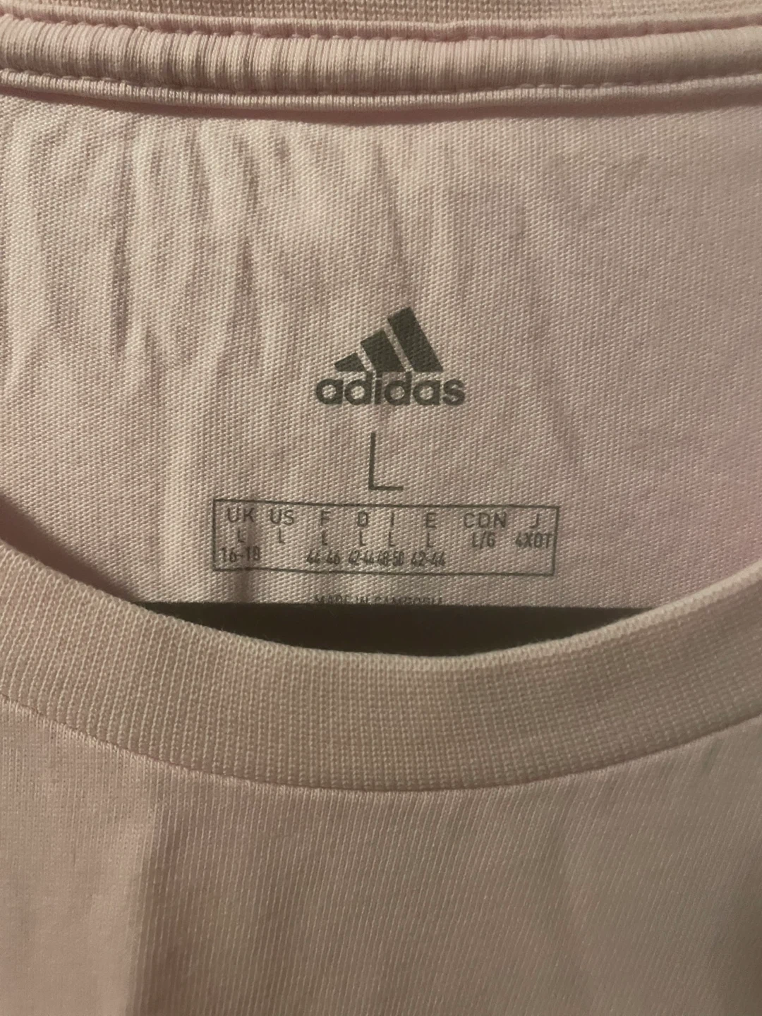 Selling a cute Adidas t-shirt in pink! It's a size large and in great condition. The Adidas logo is in white on the front. Perfect for casual wear or working out!