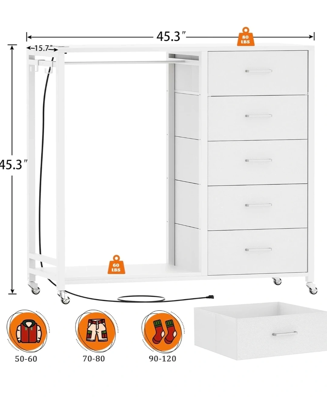 This clothes rack is great for adding extra storage to any room. It features a hanging rod, five drawers, and a bottom shelf. The dimensions are approximately 45.3" wide and 45.3" tall.