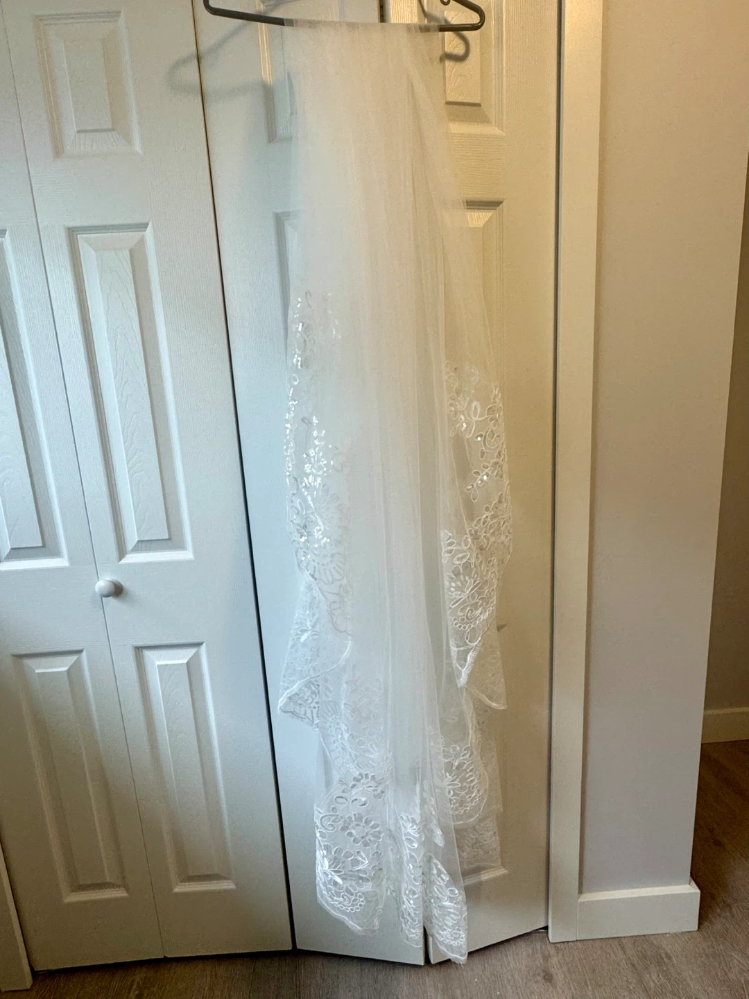 300 cm cathedral length bridal veil with elegant lace and sequin edge.