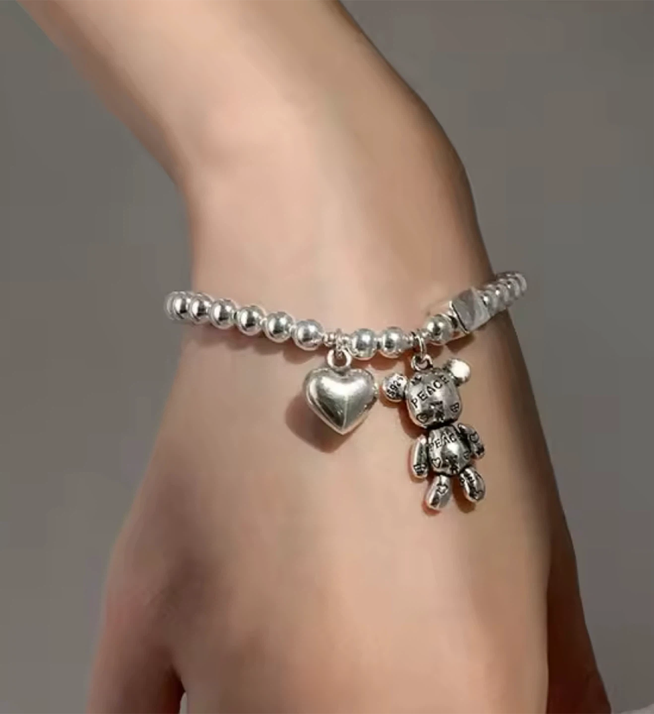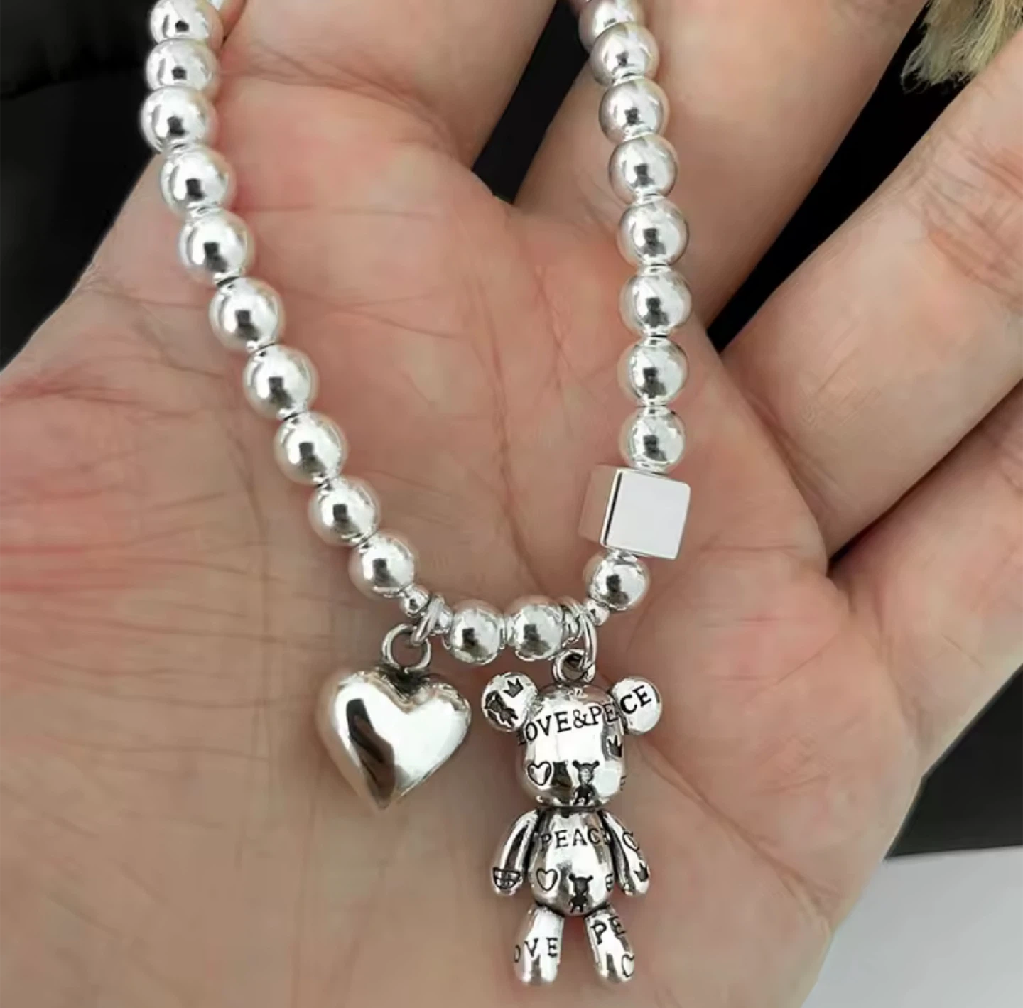 Silver plated Beaded Bracelet with Heart and Bear Charms