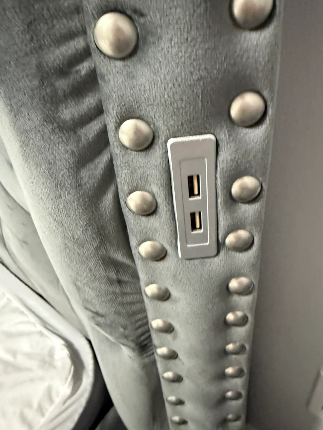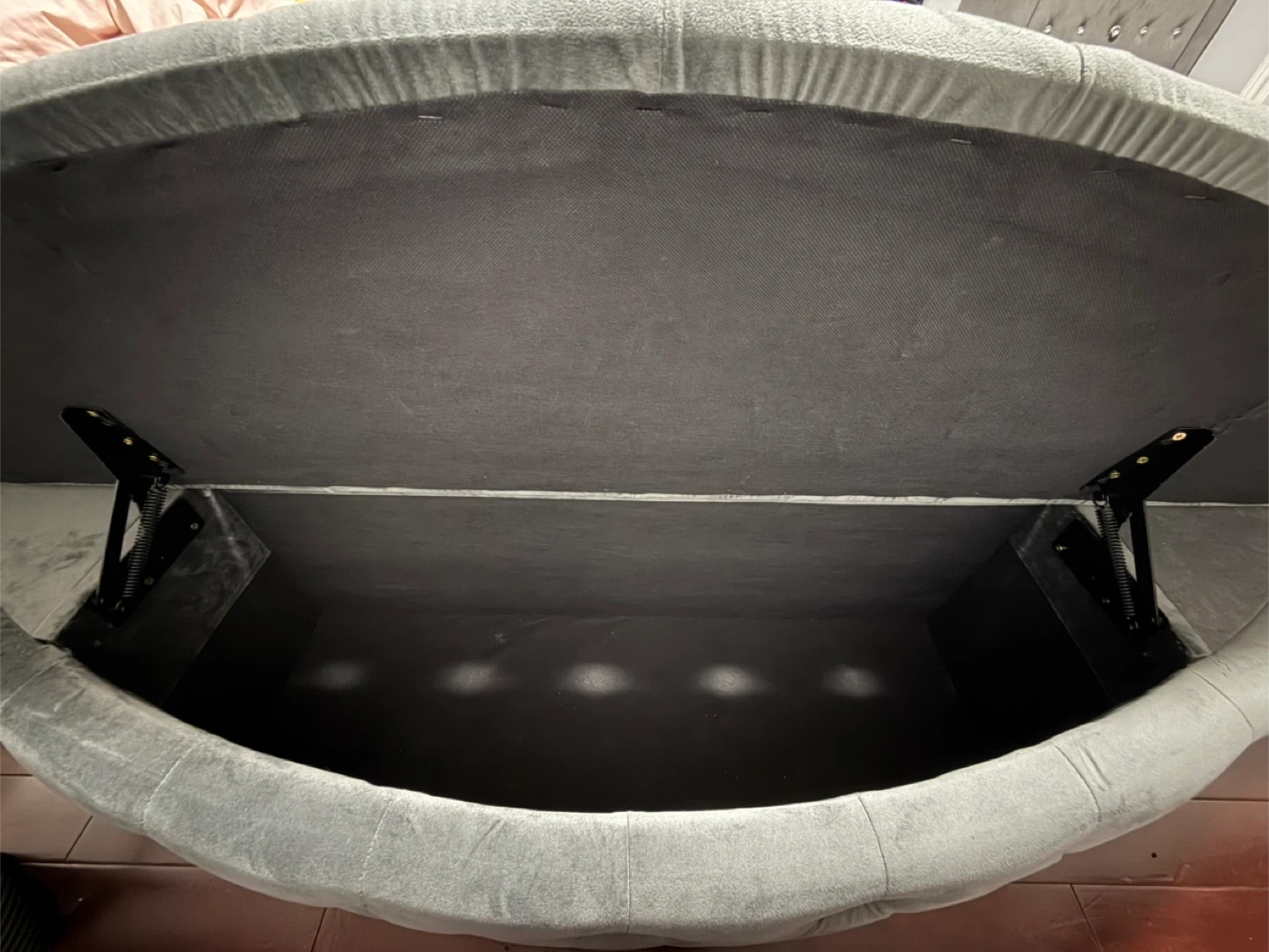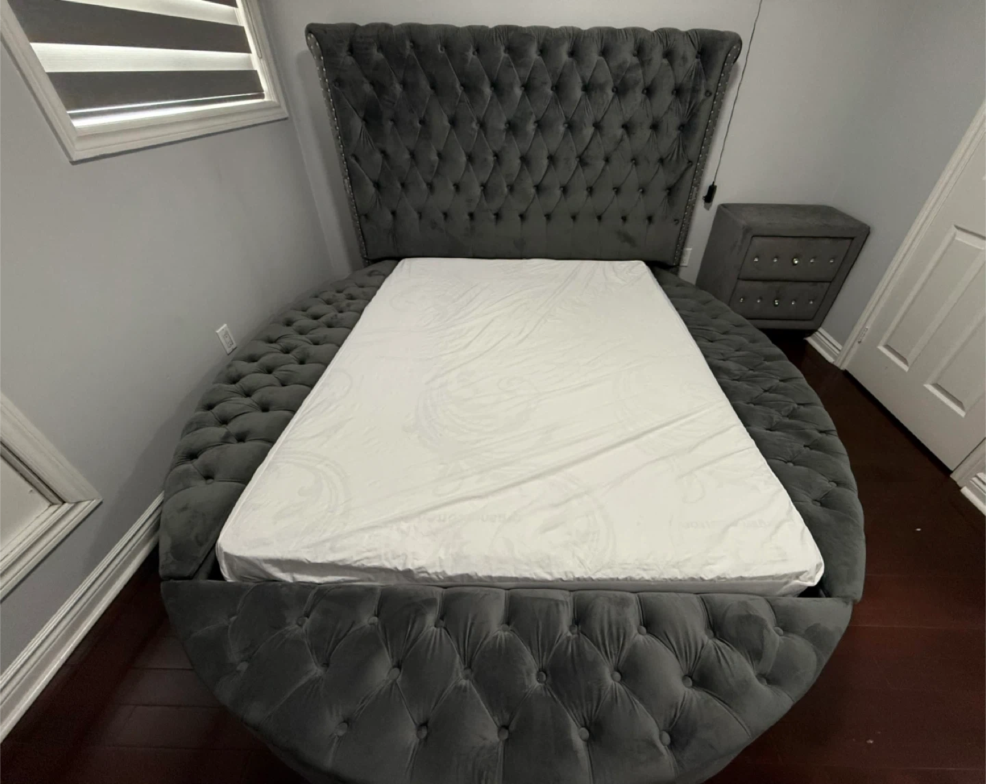 Selling a stylish grey round bed with tufted detailing! It also features 3 convenient storage areas and charging ports.