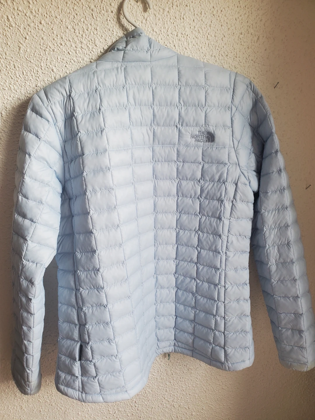 Selling a The North Face Thermoball jacket in a light blue colour! It's a women's size medium. Great for layering or wearing on its own during milder weather. It's lightweight and easy to pack!
