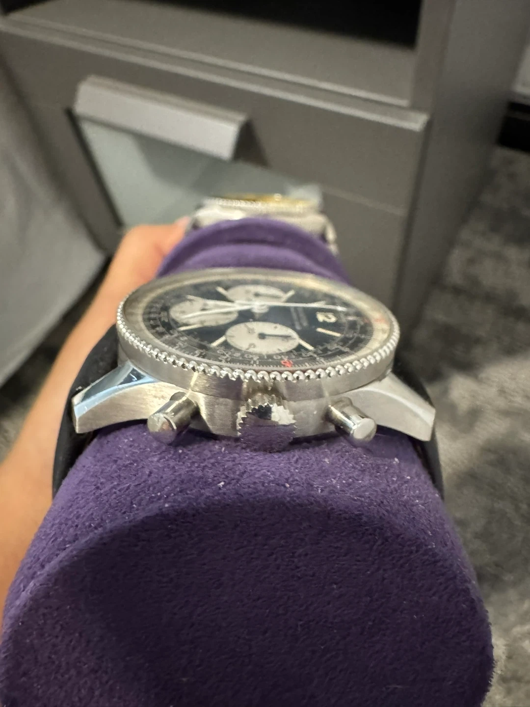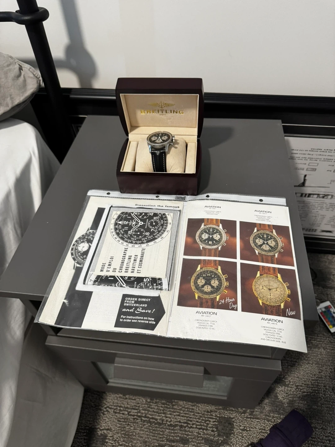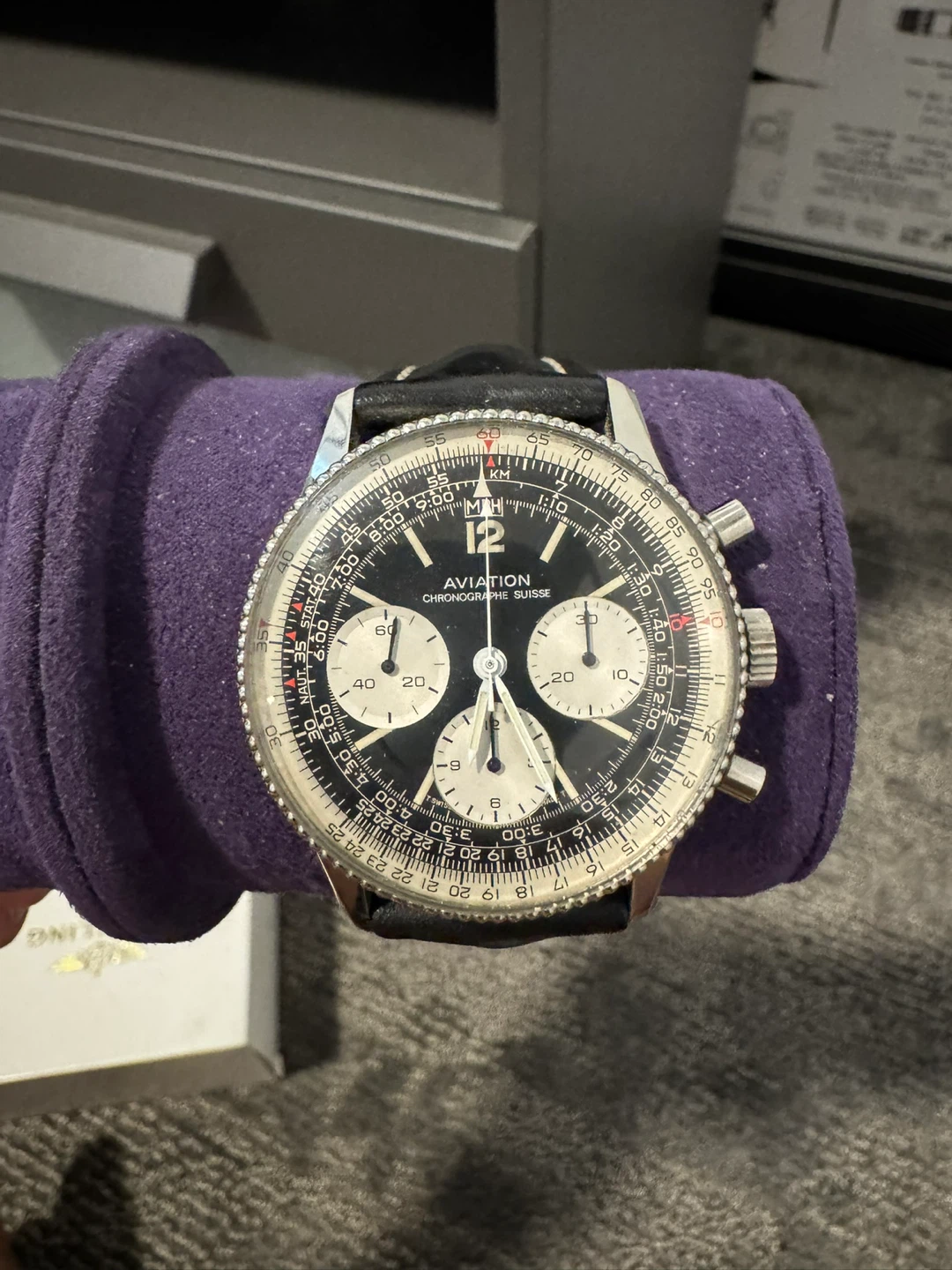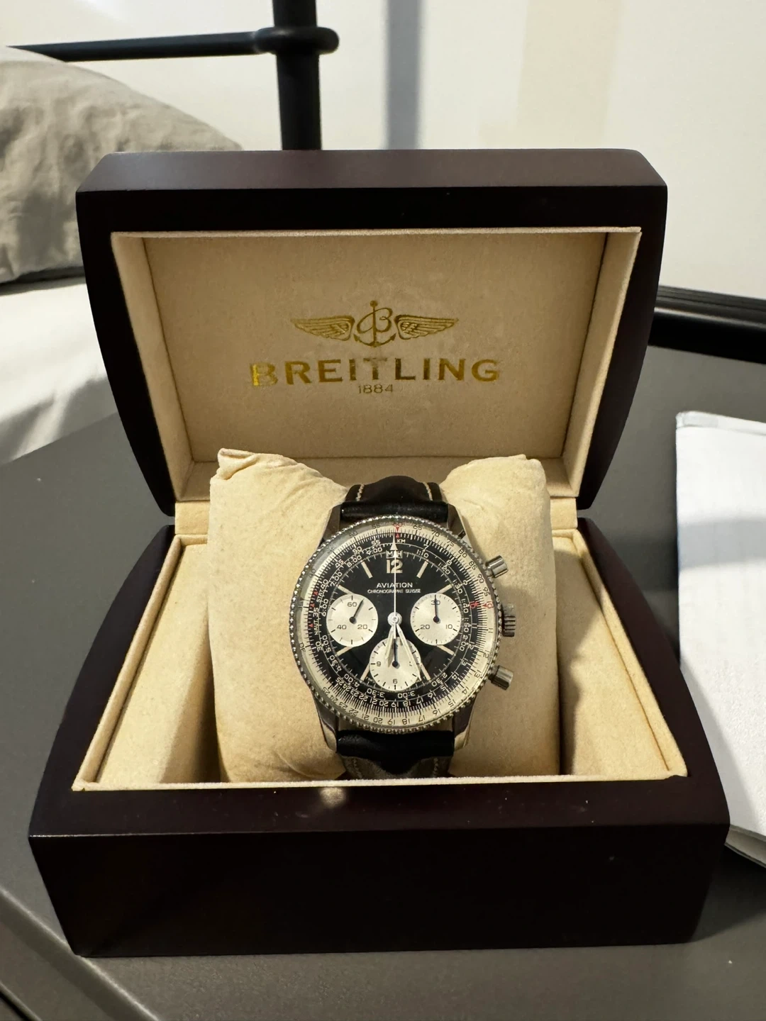 Selling a AVIATION Navitimer stainless steel chronograph watch. It features a 17 jewel vintage movement Valjoux 7736, a four-minute counter, a small second hand, and an upper push button with a start/stop function. Includes a black leather bracelet and instructions for use. Comes with the box and Papers! It’s a Breitling 806 without the Breitling name on the dial!