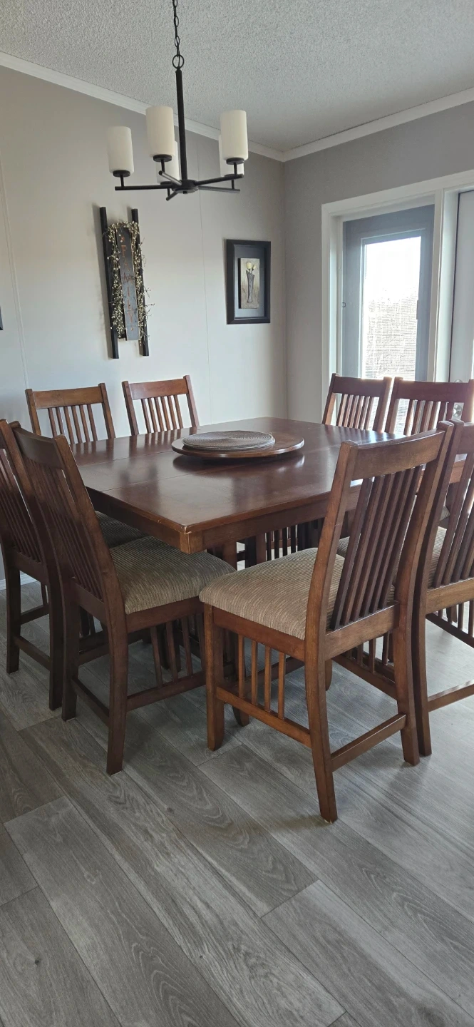 This table is 5 feet by 5 feet with leaf in and 4.5 feet by 5 feet without. Only selling as it is to big for us now and doesn't match my other furniture. Some wear on it asking 700 OBO