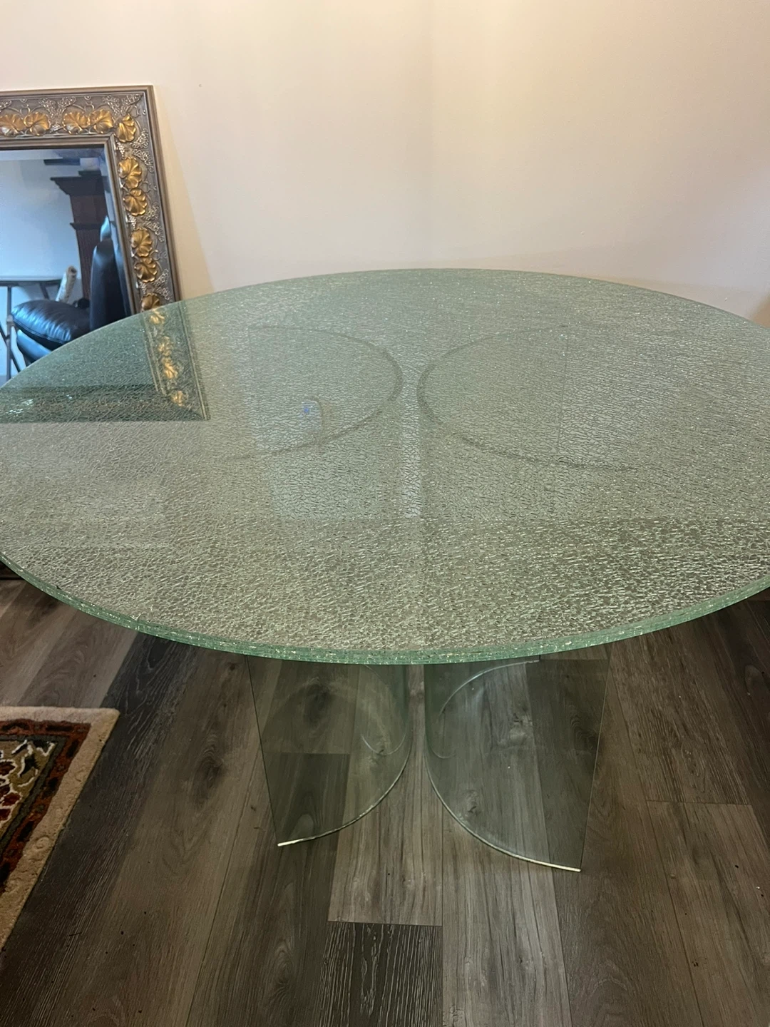Selling a round glass dining table. It has a unique textured glass top and a modern design. The table features a clear glass surface and a sturdy base. Perfect for a dining room or kitchen!