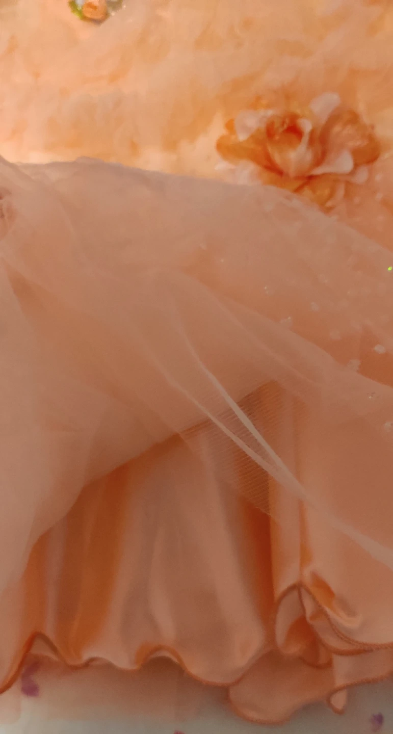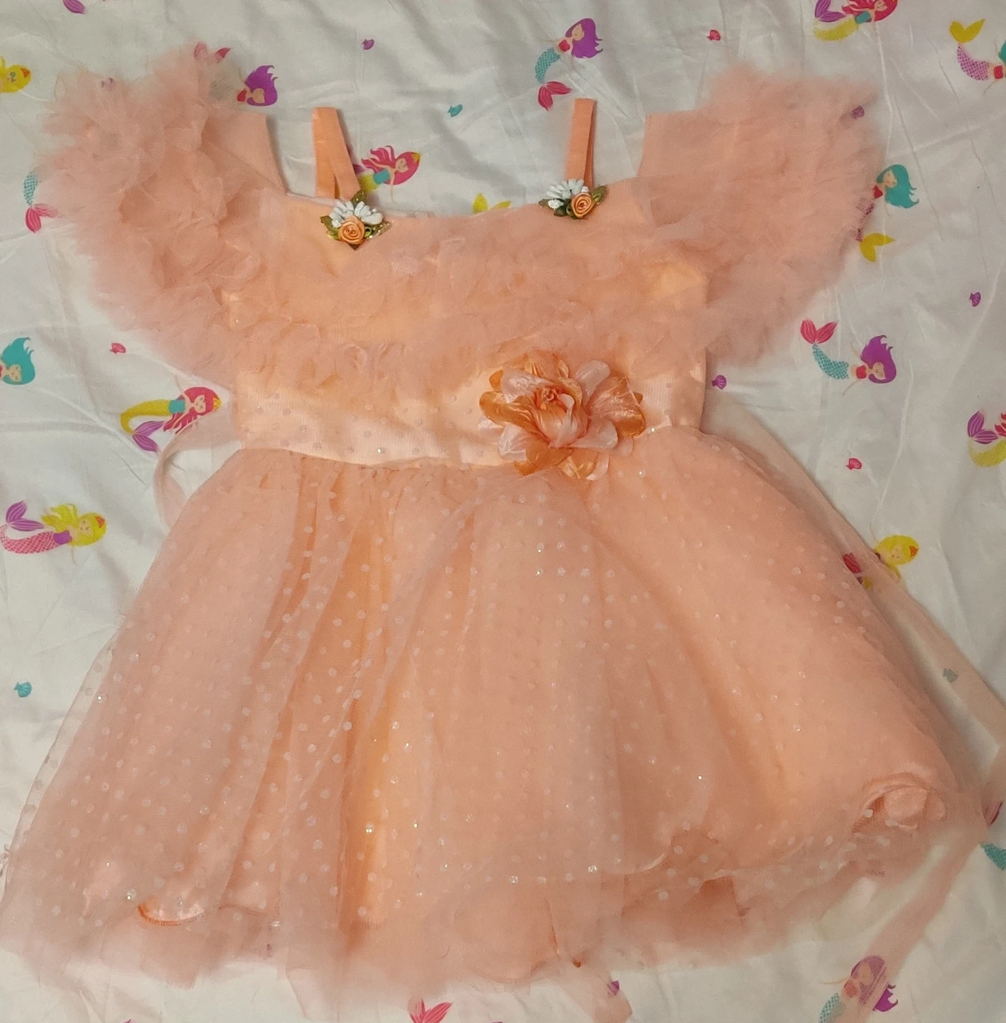 A beautiful peach dress for a little girl! It features delicate flower accents and a soft, flowing design. Perfect for special occasions or dress-up play. The dress is in great condition and ready for a new home. Would fit 3-4 years old girl.