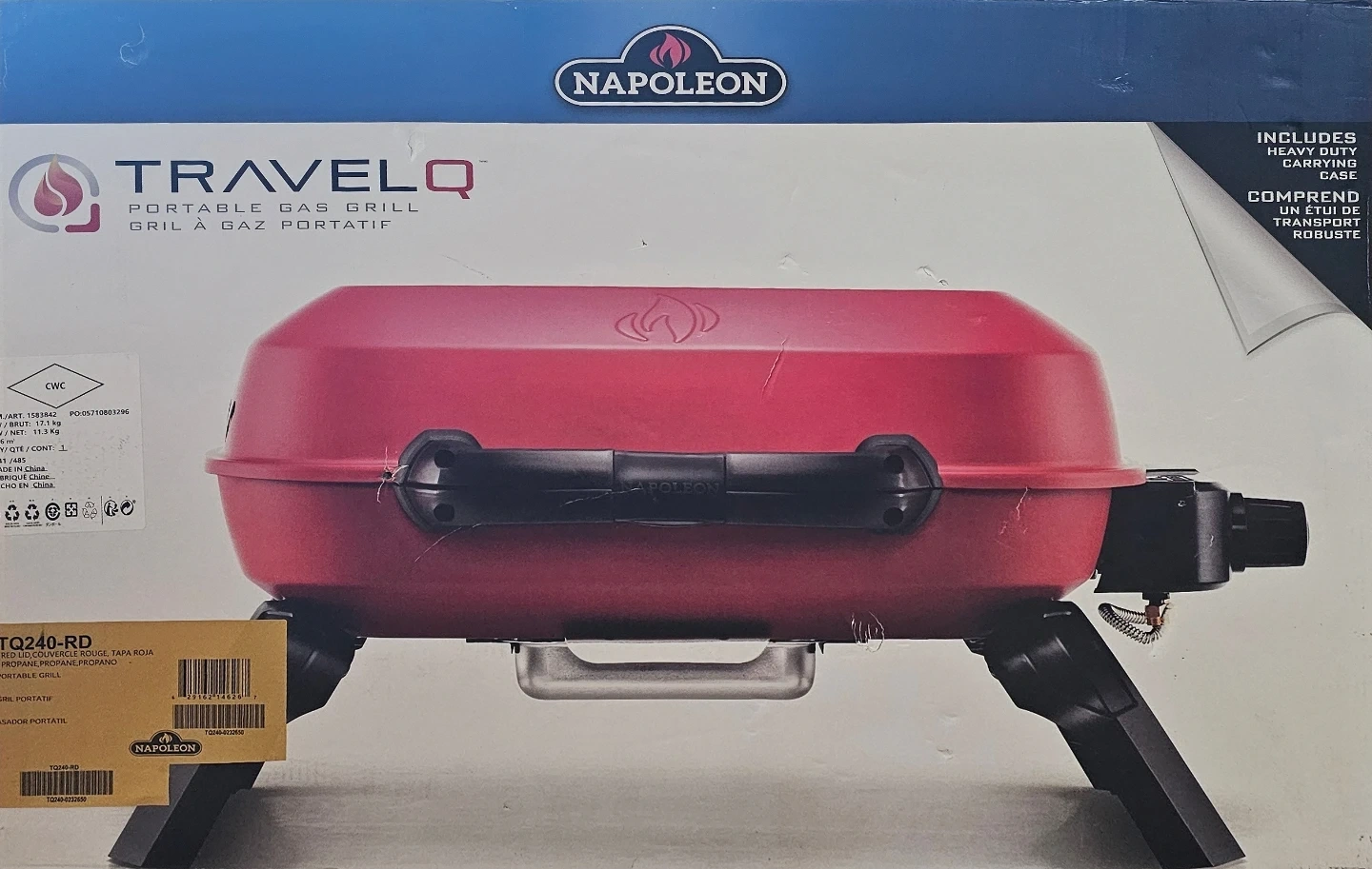Selling a Napoleon TravelQ TQ240-RD portable gas grill in red! This grill is perfect for camping, tailgating, or small patios. It includes a heavy-duty carry case for easy transport. It can cook for up to 15 burgers with its 9,000 BTU's. The assembled size is 20" x 14.4" x 15.5" (50cm x 36.5cm x 47 cm)