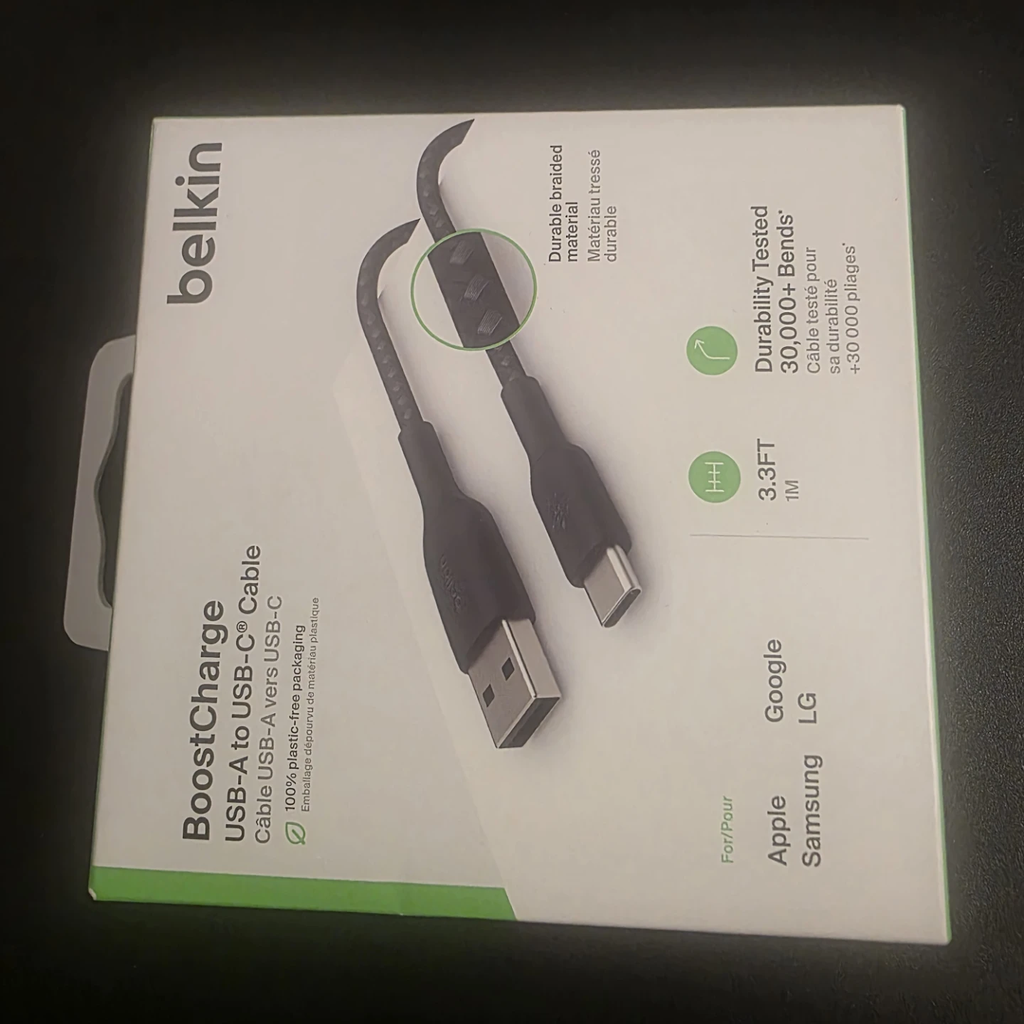 Selling a brand new Belkin BoostCharge USB-A to USB-C Cable! It's 3.3ft (1M) long and features a durable braided material. The cable is durability tested for 30,000+ bends, so it's built to last. Supports standard charging for USB-C devices. The box is included!