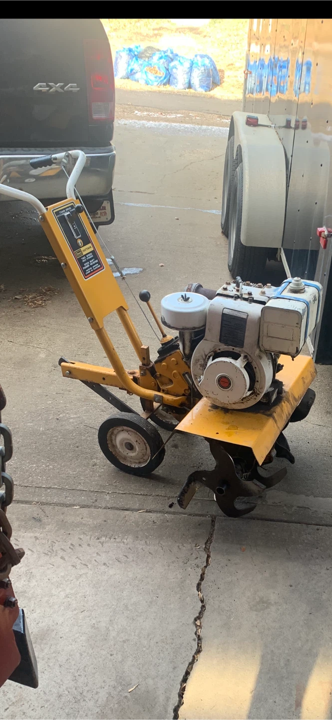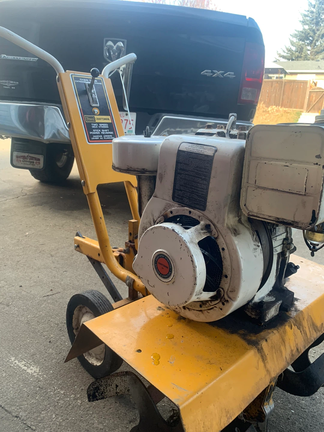 Selling a Craftsman garden tiller. It's yellow and has some signs of use, but it's ready to get your garden in shape for the season!