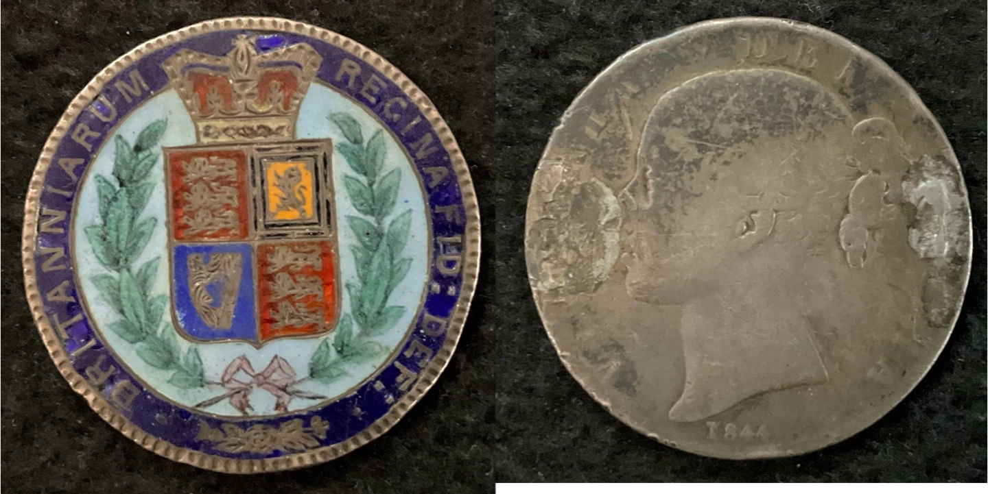 Selling a decorative brooch minus the pin. It’s an enamelled piece with beautiful colouring on one side with an 1844 portrait of Queen Victoria on the other. The Queen’s side has the pin which had been removed and shows damage. Still a great piece to add to any collection.