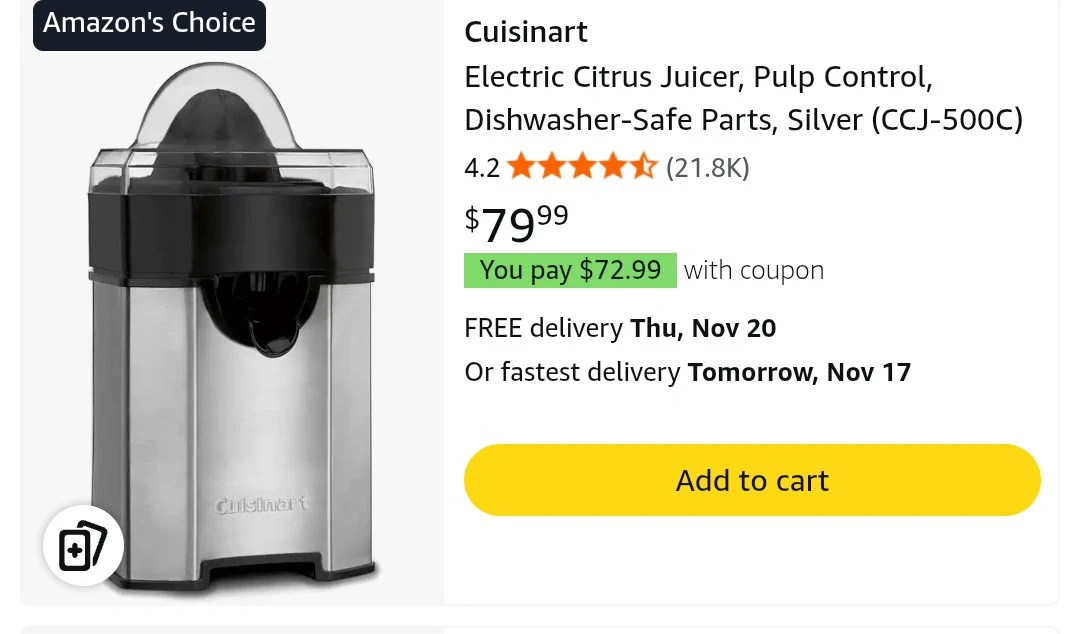 Selling a Cuisinart Pulp Control Citrus Juicer, model CCJ-500C! It's in like-new condition and comes with the original box and instruction booklet. The juicer features dishwasher-safe parts and pulp control for your preferred juice consistency. Originally bought for $79.99!