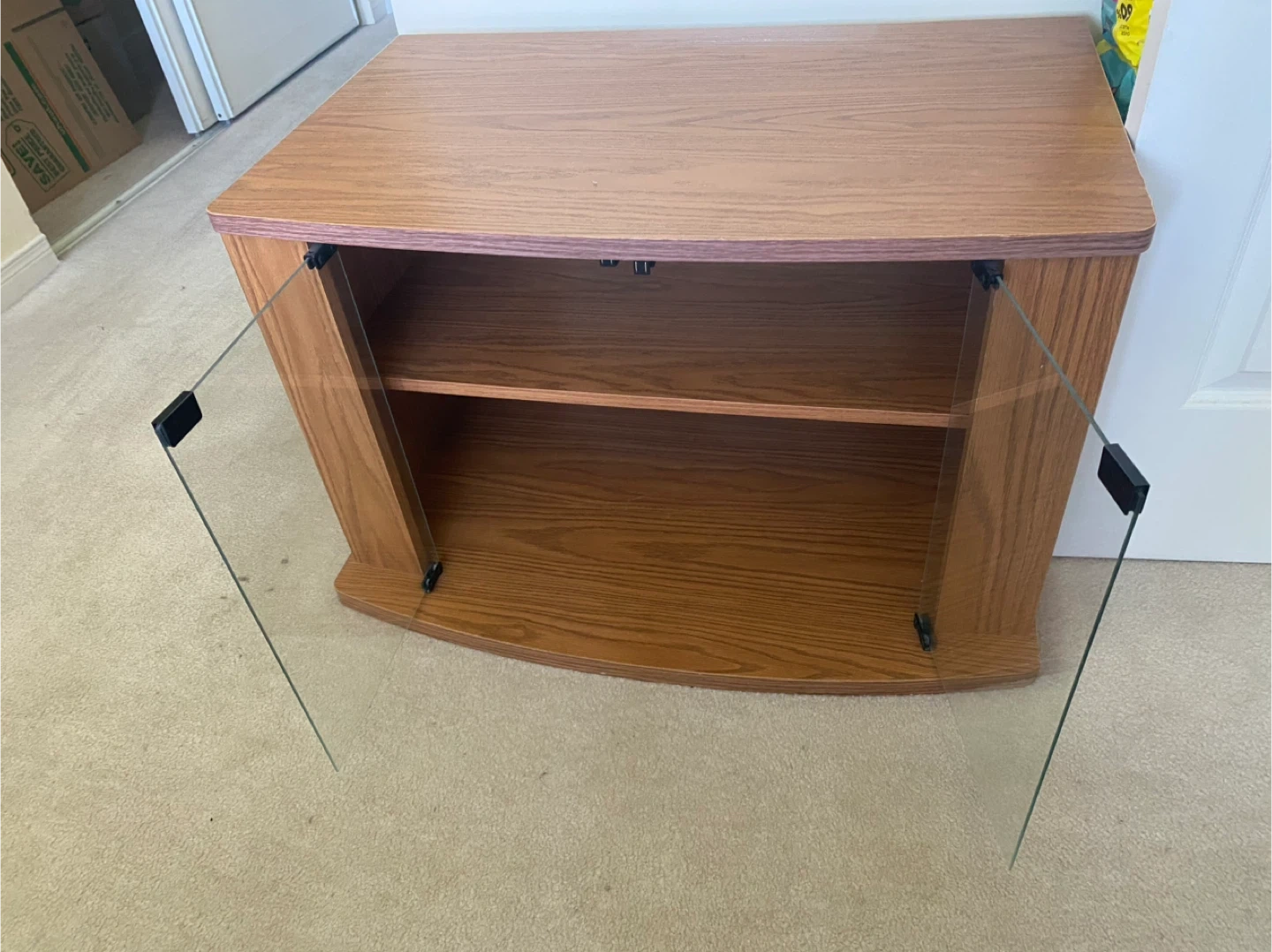 Selling a wood TV stand with glass doors! It's in great shape and has two shelves for your media devices or storage. Perfect for a smaller space or corner setup. It's sturdy and ready for a new home!