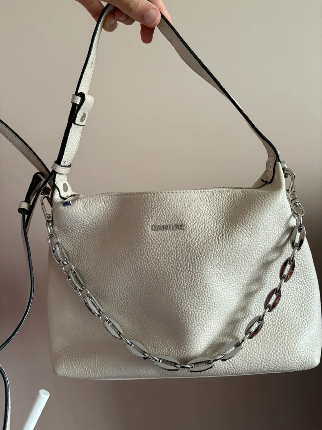 PRICE IS FIRM. DANIER Leather bag. Off white colour. Excellent condition. Like new. Worn a few times. Has a crossbody strap that can be removed. Has lovely silver chain attachment that is also removable.