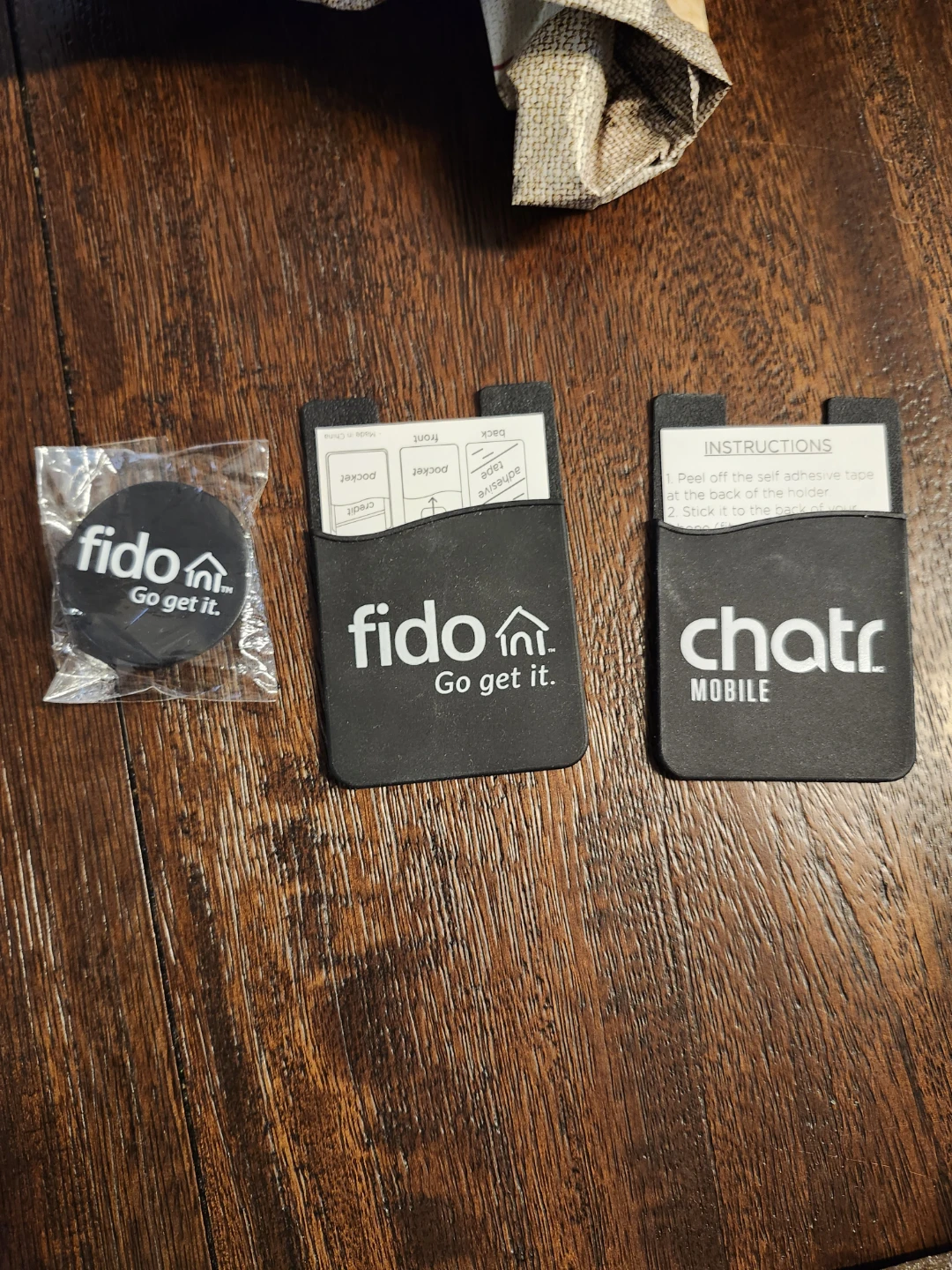 Selling a couple of phone card holders, one from Fido and one from Chatr Mobile. Also included is a Fido phone grip still in its original packaging!. As a set.
