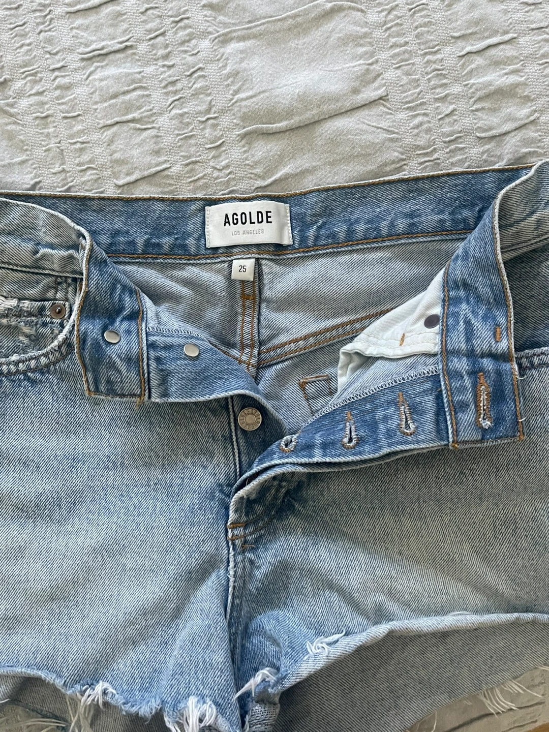 Selling a pair of AGOLDE denim shorts in size 25. They're in great condition and ready for a new home! These shorts are perfect for a casual, stylish look.