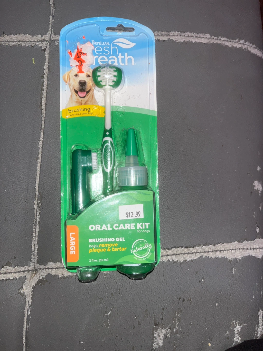 Keep your furry friend's teeth clean with the TropiClean Fresh Breath Oral Care Kit for dogs! This kit includes brushing gel, a TripleFlex toothbrush, and a soft fingertip brush. The brushing gel helps remove plaque and tartar, promoting better oral hygiene for your dog