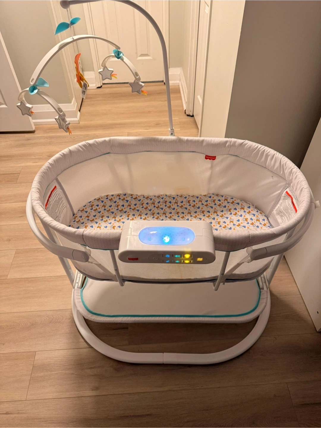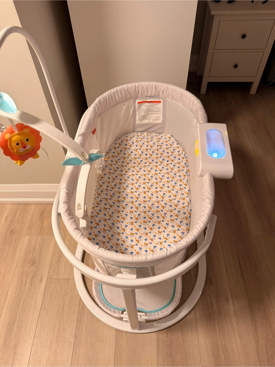 Selling a Fisher-Price Soothing Motions Bassinet! It's in great condition. This bassinet gently soothes your baby with calming vibrations, music, and light. Perfect for helping your little one drift off to sleep