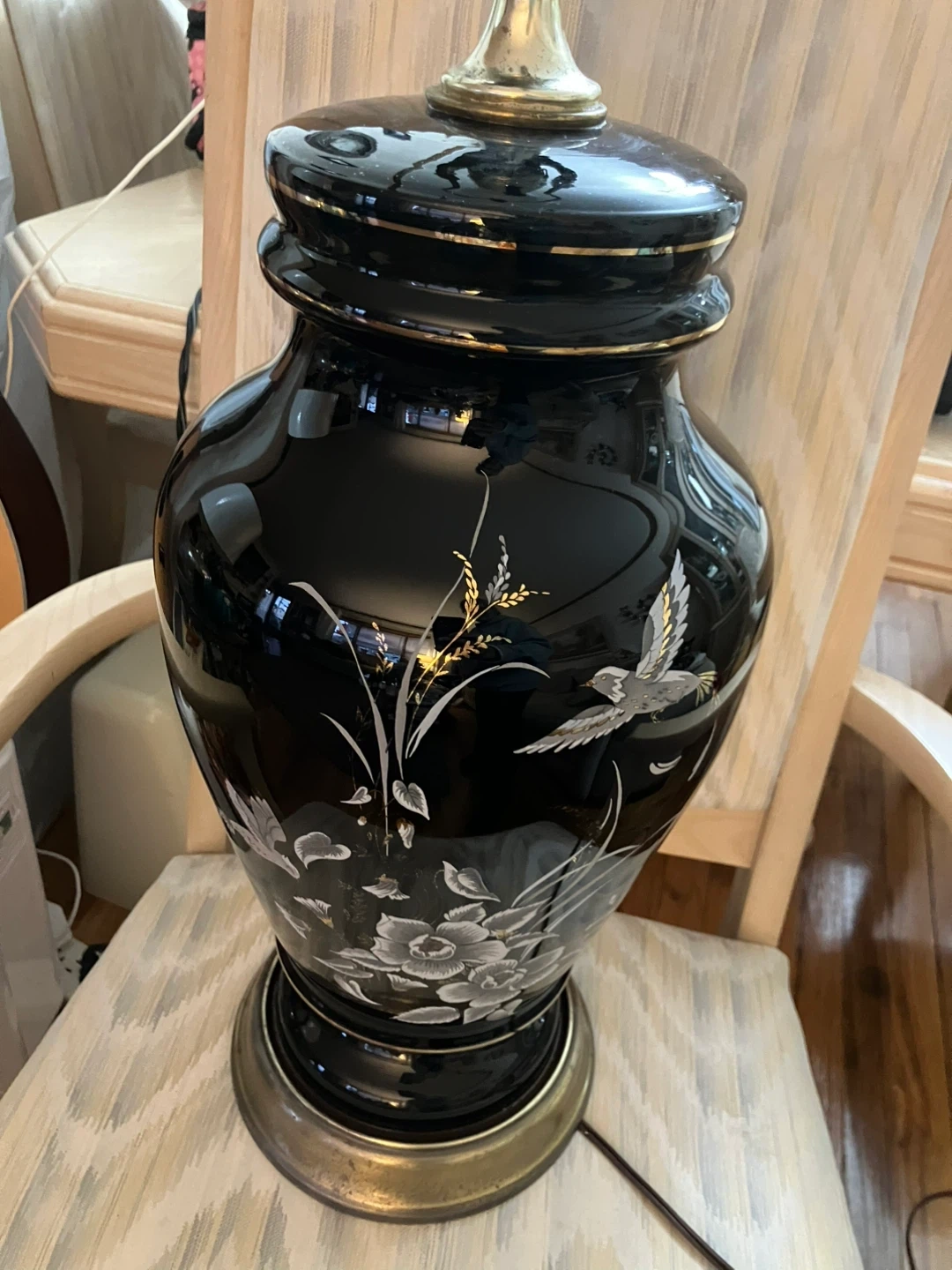 Selling a beautiful vintage table lamp. It features a glossy black finish with delicate floral and bird designs. The lamp has a classic urn shape with gold accents at the top and base. It's perfect for adding a touch of elegance to any room. I have 2 selling for $15 each. Does not have a shade.