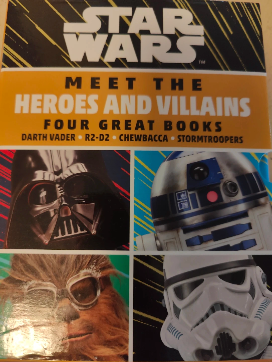 Selling a Star Wars book set titled "Meet the Heroes and Villains". This set includes four great books featuring Darth Vader, R2-D2, Chewbacca, and Stormtroopers. Perfect for any Star Wars fan!