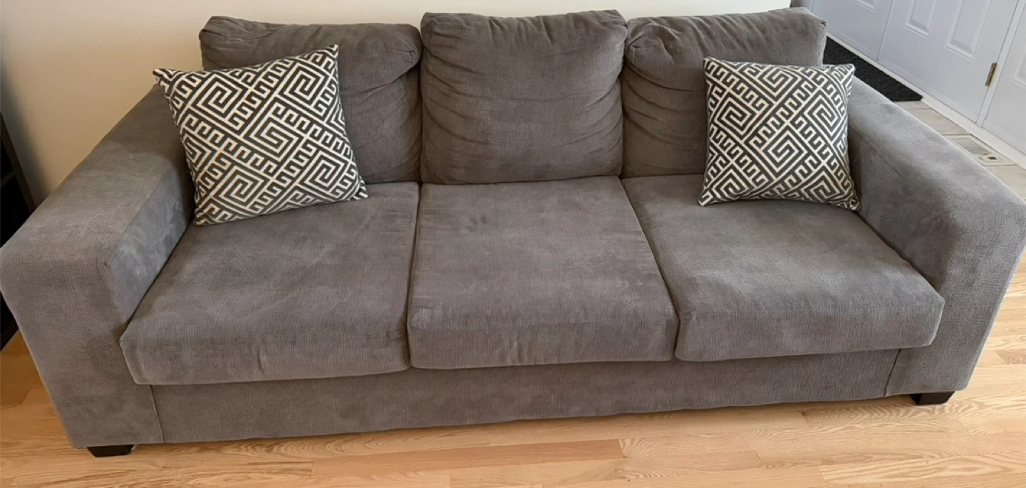 222Selling a comfy grey three-seat sofa! It comes with two decorative pillows as shown in the pictures. Good condition. One plastic foot is slightly damaged on the bottom but the couch does not scratch the floor if a felt pad is used. Felt pads used on all four legs. No stains. No tears. Couch is approximately: 7 feet long, 3 feet 1 inches wide, 2 feet 7 inches tall. For pickup only
