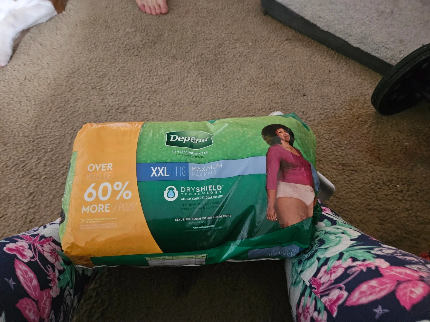 Selling a pack of Depend Fit-Flex Underwear, size XXL. The packaging says it includes over 60% more, and features Dryshield Technology for all-day comfort. Beautiful blush colour and designs