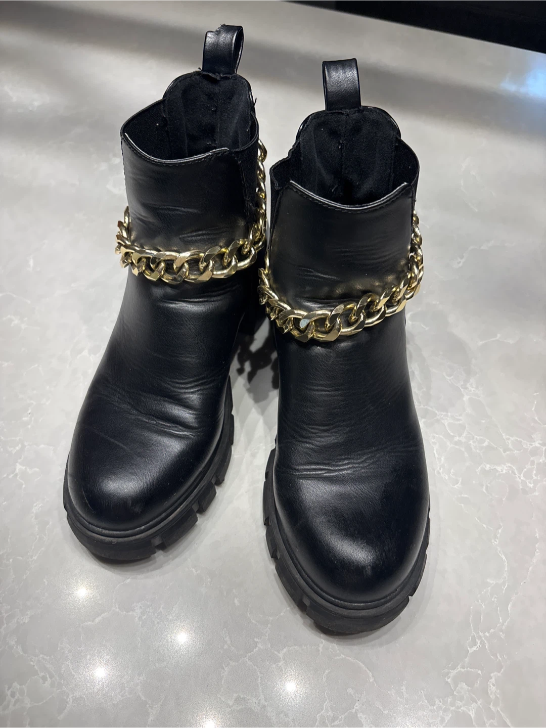 Cute black ankle boots with a gold chain detail! They are in great condition and ready for a new home. Perfect for adding a bit of edge to your outfit!