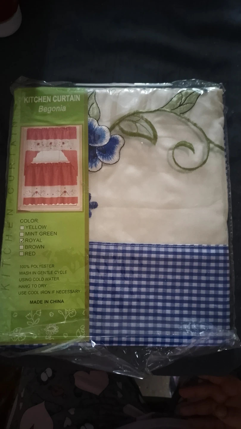 I'm selling a Kitchen Curtain Begonia in royal blue! It's made of 100% polyester and can be washed in a gentle cycle with cold water. Hang to dry and use a cool iron if necessary. The package contains a swag (60" x 36") and a bottom curtain (30" x 30", 2 pieces)