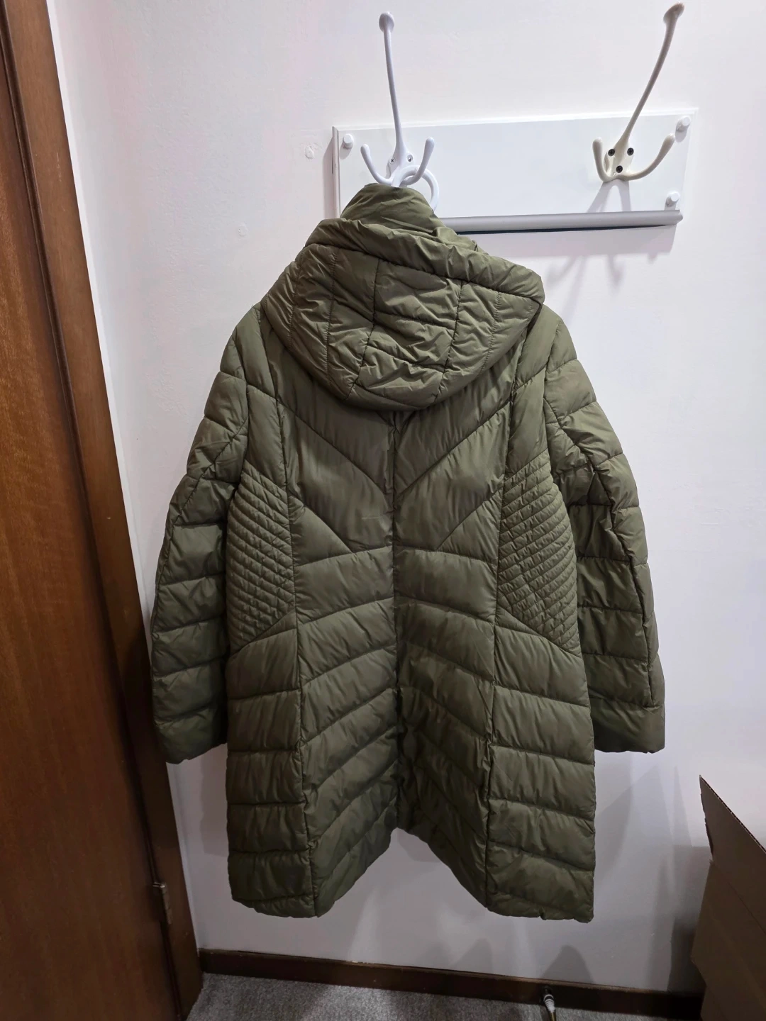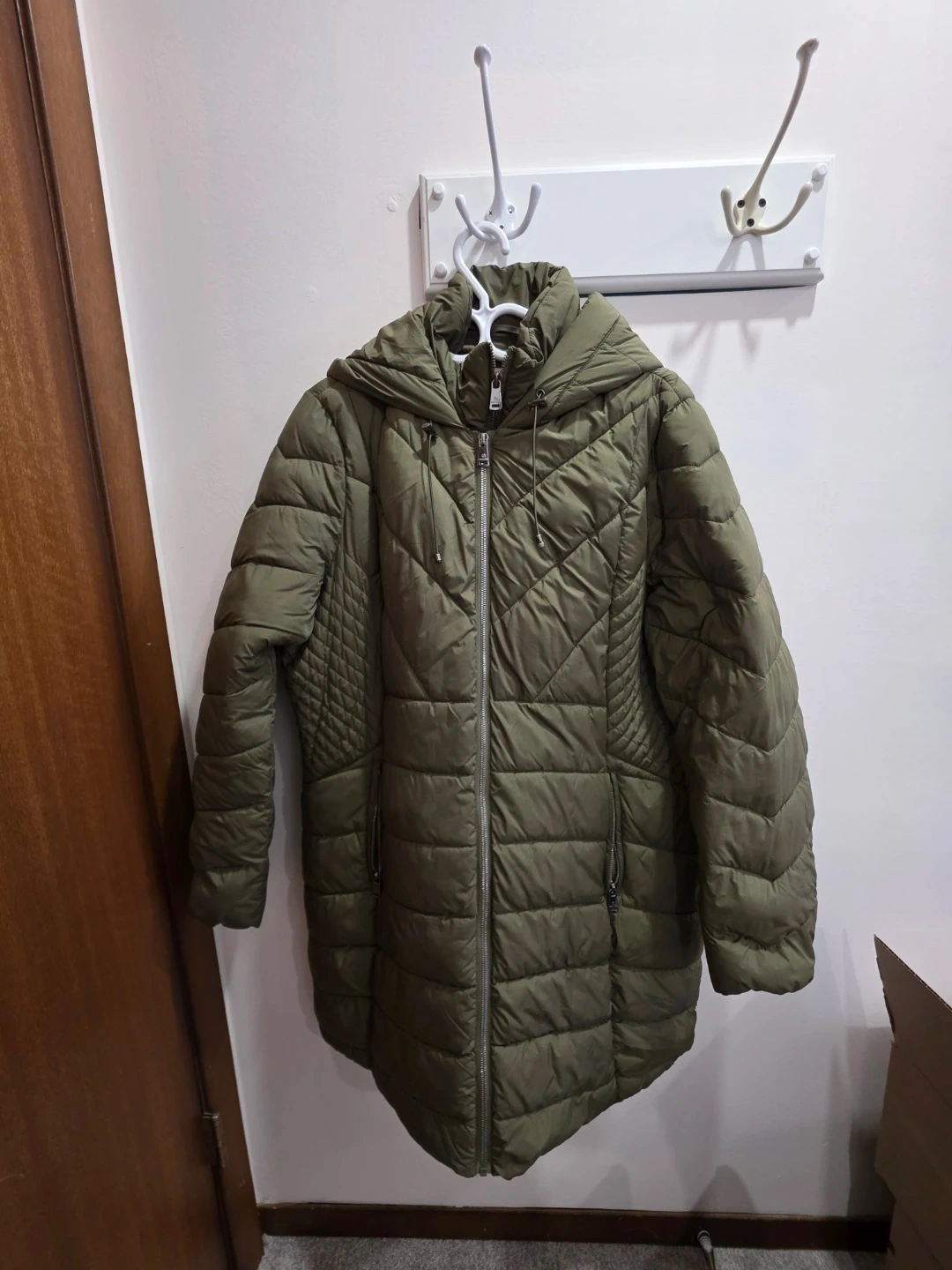 Selling a cozy olive green puffer jacket! It's in great shape and perfect for staying warm during the cooler months. The jacket features a hood for extra protection from the elements. It's a stylish and practical addition to any wardrobe!