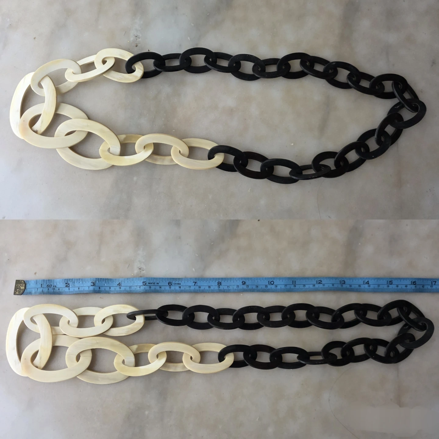 Selling a stylish two-tone buffalo Horn necklace! It features a mix of black and beige links, creating a unique and eye-catching design. The necklace is 86cm in length, making it a statement piece that's sure to turn heads.