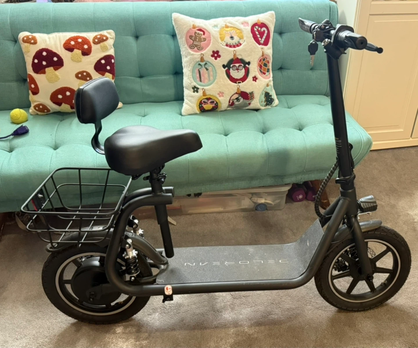 Selling a Delorean electric scooter in great condition! It comes with a seat and a basket attached to the back. Perfect for getting around town