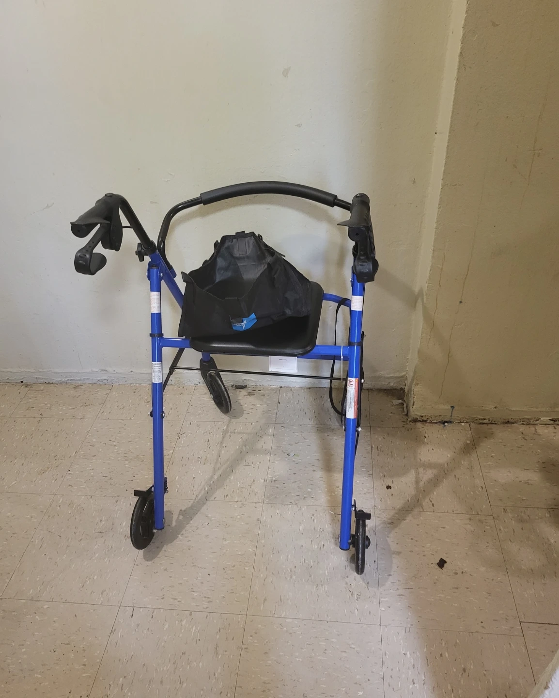 Selling a blue walker with a seat. It has a handy basket in the front for carrying items. The walker is in good condition and ready to help someone get around safely and comfortably