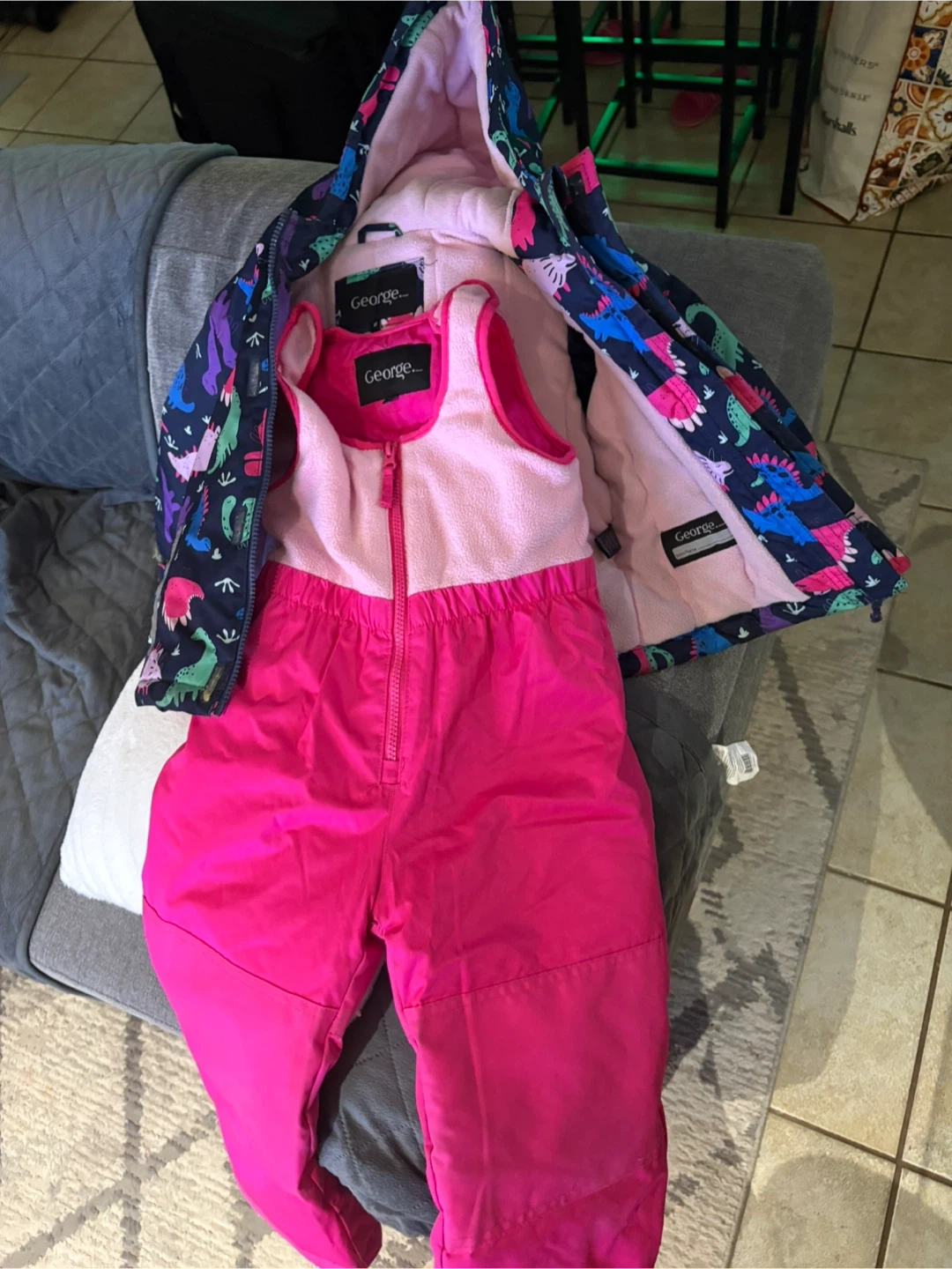 Selling a cute George snowsuit set in size 3T. It includes a pink snow bib and a dinosaur print jacket. Perfect for keeping your little one warm and cozy this winter!