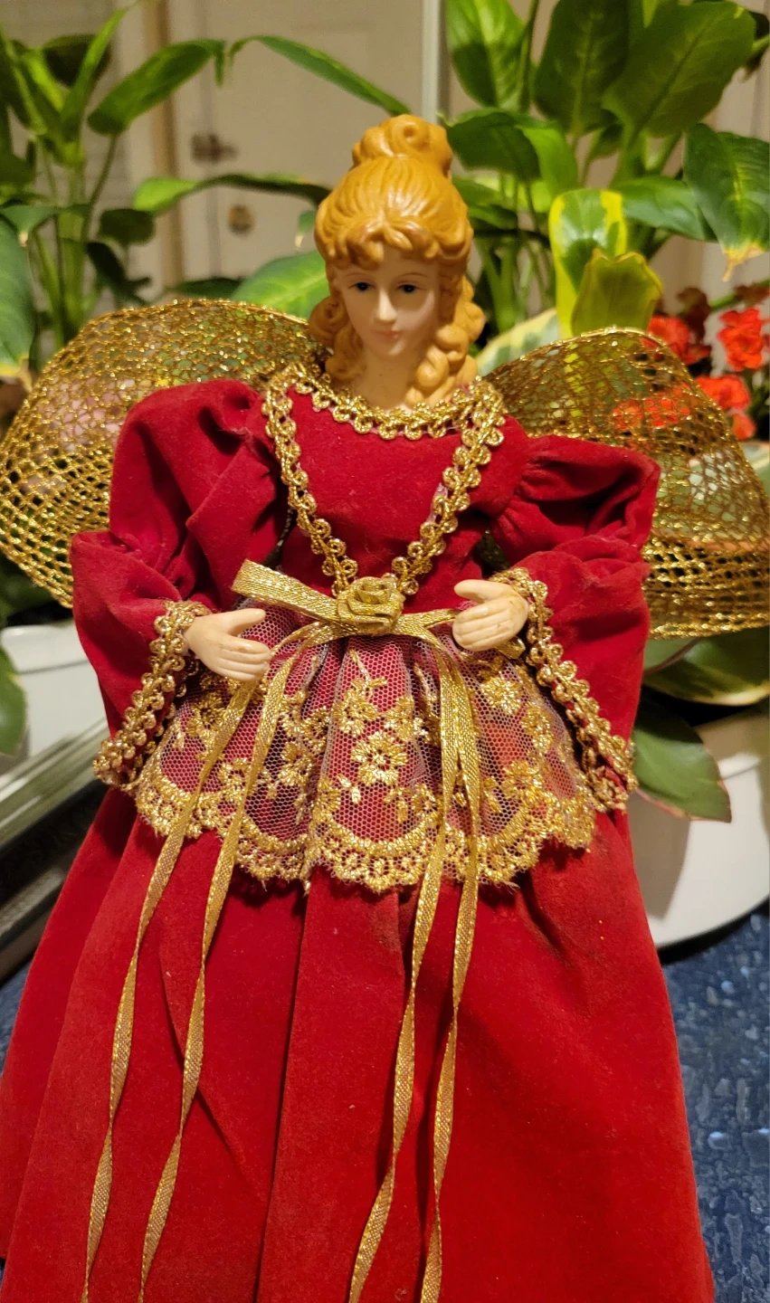 Selling a vintage 12" beautiful angel figurine. It features a red velvet dress and gold accents. Perfect for holiday decor as your xmas tree topper or as a table top decorative piece!